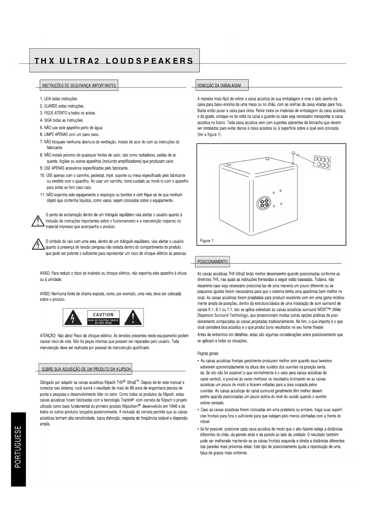 objeto que contenha líquidos, como vasos, sejam colocados sobre o equipamento. O ponto de exclamação dentro de um triângulo equilátero visa alertar o usuário quanto à inclusão de instruções importantes sobre o funcionamento e a manutenção (reparos) no material impresso que acompanha o produto. O símbolo do raio com uma seta, dentro de um triângulo equilátero, visa alertar o usuário quanto à presença de tensão perigosa não isolada dentro do compartimento do produto, que pode ser potente o suficiente para representar um risco de choque elétrico às pessoas. AVISO: Para reduzir o risco de incêndio ou choque elétrico, não exponha este aparelho à chuva ou à umidade. AVISO: Nenhuma fonte de chama exposta, como, por exemplo, uma vela, deve ser colocada sobre o produto. ATENÇÃO: Não abra! Risco de choque elétrico. As tensões presentes neste equipamento podem causar risco de vida. Não há peças internas que possam ser reparadas pelo usuário. Toda manutenção deve ser realizada por pessoal de manutenção qualificado. SOBRE SUA AQUISIÇÃO DE UM PRODUTO DA KLIPSCH Obrigado por adquirir as caixas acústicas Klipsch THX