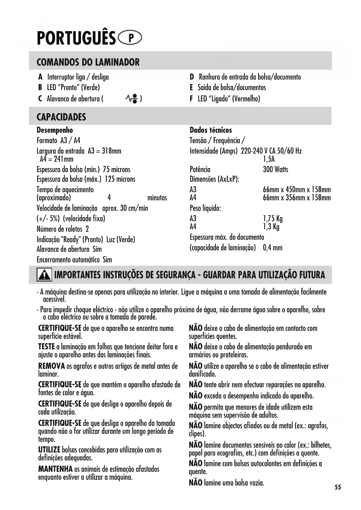 D Ranhura de entrada da bolsa/documento E Saída de bolsa/documentos F LED “Ligado” (Vermelho) CAPACIDADES - A máquina destina-se apenas para utilização no interior. Ligue a máquina a uma tomada de alimentação facilmente acessível. - Para impedir choque eléctrico - não utilize o aparelho próximo de água, não derrame água sobre o aparelho, sobre o cabo eléctrico ou sobre a tomada de parede. CERTIFIQUE-SE de que o aparelho se encontra numa superfície estável. TESTE a laminação em folhas que tencione deitar fora e ajuste o aparelho antes das laminações finais. REMOVA os agrafos e outros artigos de metal antes de laminar. CERTIFIQUE-SE de que mantém o aparelho afastado de fontes de calor e água. CERTIFIQUE-SE de que desliga o aparelho depois de cada utilização. CERTIFIQUE-SE de que desliga o aparelho da tomada quando não o for utilizar durante um longo período de tempo. UTILIZE bolsas concebidas para utilização com as definições adequadas. MANTENHA os animais de estimação afastados enquanto estiver a utilizar a máquina. NÃO deixe o cabo de alimentação em contacto com superfícies quentes. NÃO deixe o cabo de alimentação pendurado em armários ou prateleiras. NÃO utilize o aparelho se o cabo de alimentação estiver danificado. NÃO tente abrir nem efectuar reparações no aparelho. NÃO exceda o desempenho indicado do aparelho. NÃO permita que menores de idade utilizem esta máquina sem supervisão de adultos. NÃO lamine objectos afiados ou de metal (ex.: agrafos, clipes). NÃO lamine documentos sensíveis ao calor (ex.: bilhetes, papel para ecografias, etc.) com definições a quente. NÃO lamine com bolsas autocolantes em definições a quente. NÃO lamine uma bolsa vazia. PORTUGUÊS