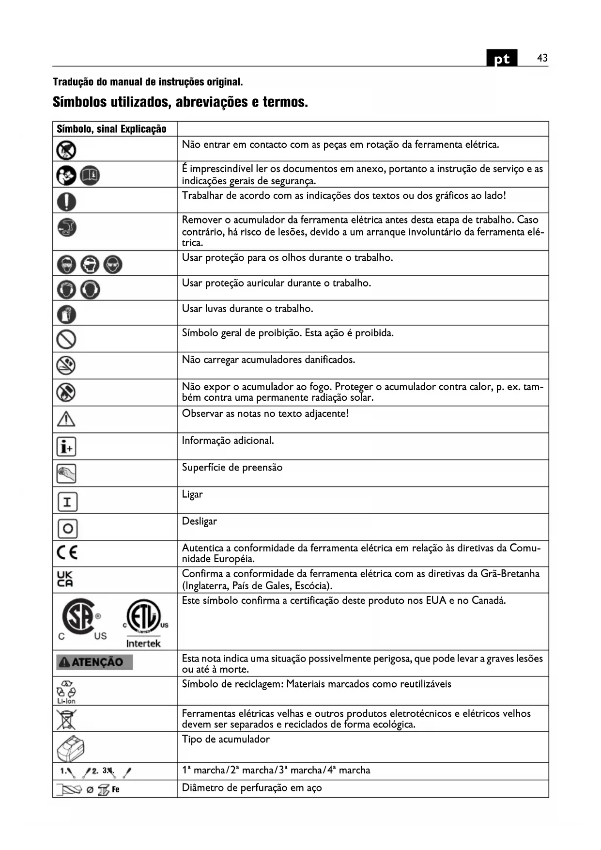 Tradução do manual de instruções original. Símbolos utilizados, abreviações e termos. Símbolo, sinal Explicação Não entrar em contacto com as peças em rotação da ferramenta elétrica. É imprescindível ler os documentos em anexo, portanto a instrução de serviço e as indicações gerais de segurança. Trabalhar de acordo com as indicações dos textos ou dos gráficos ao lado! Remover o acumulador da ferramenta elétrica antes desta etapa de trabalho. Caso contrário, há risco de lesões, devido a um arranque involuntário da ferramenta elé- trica. Usar proteção para os olhos durante o trabalho. Usar proteção auricular durante o trabalho. Usar luvas durante o trabalho. Símbolo geral de proibição. Esta ação é proibida. Não carregar acumuladores danificados. Não expor o acumulador ao fogo. Proteger o acumulador contra calor, p. ex. tam- bém contra uma permanente radiação solar. Observar as notas no texto adjacente! Informação adicional. Superfície de preensão Ligar Desligar Autentica a conformidade da ferramenta elétrica em relação às diretivas da Comu- nidade Européia. Confirma a conformidade da ferramenta elétrica com as diretivas da Grã-Bretanha (Inglaterra, País de Gales, Escócia). Este símbolo confirma a certificação deste produto nos EUA e no Canadá. Esta nota indica uma situação possivelmente perigosa, que pode levar a graves lesões ou até à morte. Símbolo de reciclagem: Materiais marcados como reutilizáveis Ferramentas elétricas velhas e outros produtos eletrotécnicos e elétricos velhos devem ser separados e reciclados de forma ecológica. Tipo de acumulador 1ª marcha/2ª marcha/3ª marcha/4ª marcha Diâmetro de perfuração em aço