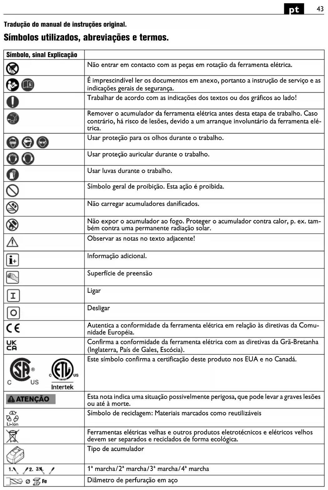 Tradução do manual de instruções original. Símbolos utilizados, abreviações e termos. Símbolo, sinal Explicação Não entrar em contacto com as peças em rotação da ferramenta elétrica. É imprescindível ler os documentos em anexo, portanto a instrução de serviço e as indicações gerais de segurança. Trabalhar de acordo com as indicações dos textos ou dos gráficos ao lado! Remover o acumulador da ferramenta elétrica antes desta etapa de trabalho. Caso contrário, há risco de lesões, devido a um arranque involuntário da ferramenta elé- trica. Usar proteção para os olhos durante o trabalho. Usar proteção auricular durante o trabalho. Usar luvas durante o trabalho. Símbolo geral de proibição. Esta ação é proibida. Não carregar acumuladores danificados. Não expor o acumulador ao fogo. Proteger o acumulador contra calor, p. ex. tam- bém contra uma permanente radiação solar. Observar as notas no texto adjacente! Informação adicional. Superfície de preensão Ligar Desligar Autentica a conformidade da ferramenta elétrica em relação às diretivas da Comu- nidade Européia. Confirma a conformidade da ferramenta elétrica com as diretivas da Grã-Bretanha (Inglaterra, País de Gales, Escócia). Este símbolo confirma a certificação deste produto nos EUA e no Canadá. Esta nota indica uma situação possivelmente perigosa, que pode levar a graves lesões ou até à morte. Símbolo de reciclagem: Materiais marcados como reutilizáveis Ferramentas elétricas velhas e outros produtos eletrotécnicos e elétricos velhos devem ser separados e reciclados de forma ecológica. Tipo de acumulador 1ª marcha/2ª marcha/3ª marcha/4ª marcha Diâmetro de perfuração em aço