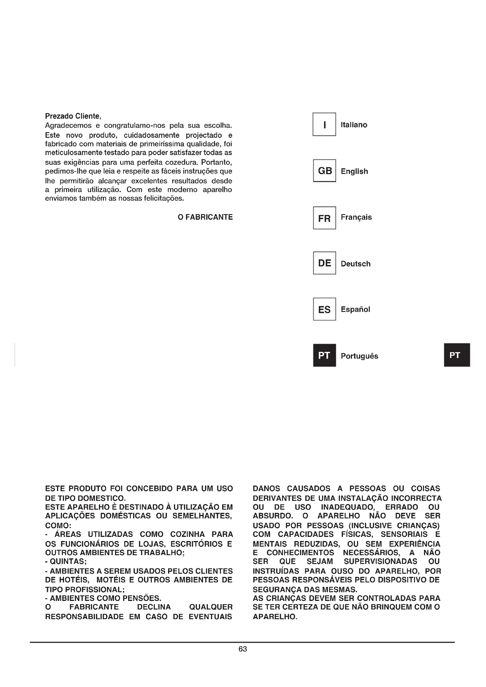 Agradecemos e congratulamo-nos pela sua escola. Este novo produit, cuidadosamente projectado e fabricado com materiais de primeirissima calidad, foi meticulosamente testado para poder satisfazer todas as suas exigências para uma perfeita cozedura. Portanto, pedimos-lhe que leia e respeite as vezes instruções que lhe permitirão alcantar excellentes resultados desde a primarya'utilização. Com este moderno aparecido enviamos también as nossas felicitações.