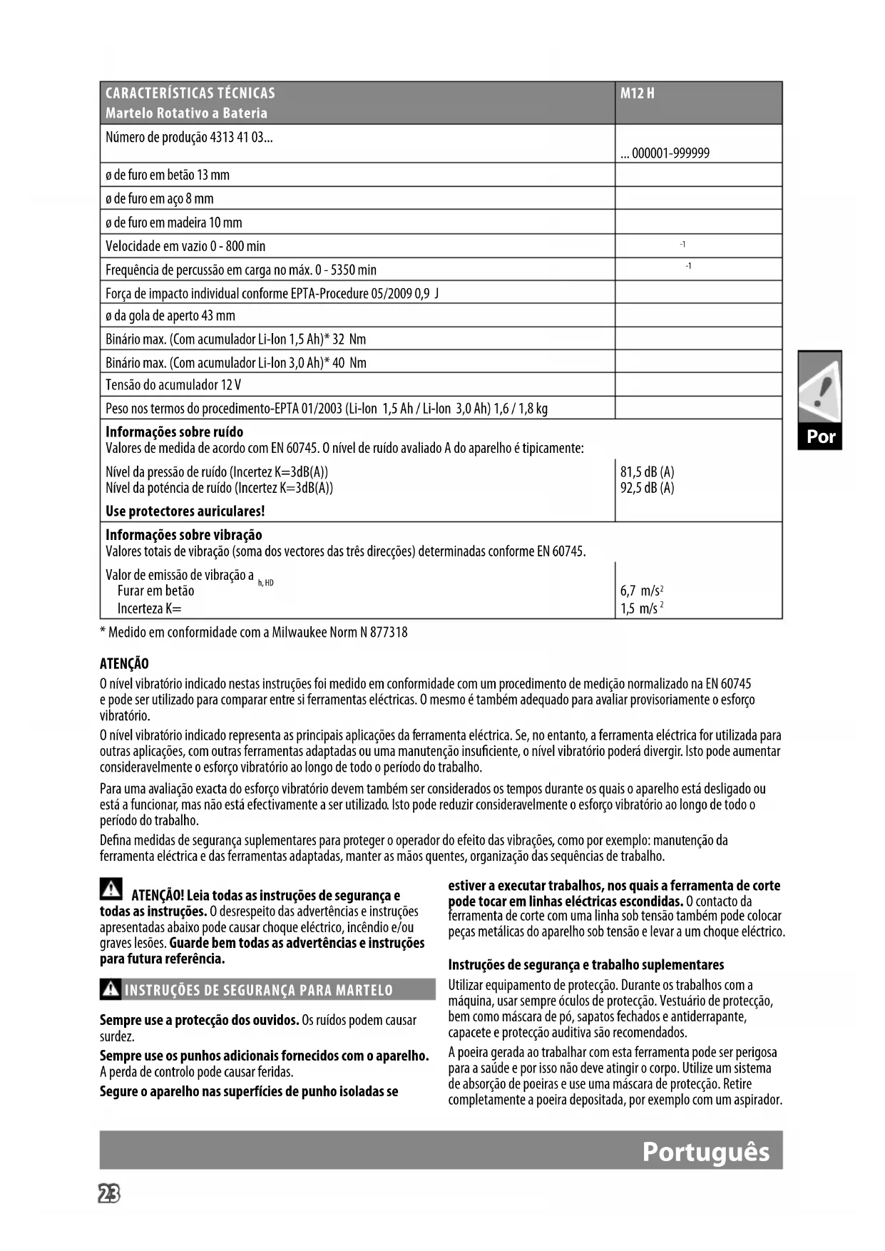 - Medido em conformidade com a Milwaukee Norm N 877318 ATENÇÃO O nível vibratório indicado nestas instruções foi medido em conformidade com um procedimento de medição normalizado na EN 60745 e pode ser utilizado para comparar entre si ferramentas eléctricas. O mesmo é também adequado para avaliar provisoriamente o esforço vibratório. O nível vibratório indicado representa as principais aplicações da ferramenta eléctrica. Se, no entanto, a ferramenta eléctrica for utilizada para outras aplicações, com outras ferramentas adaptadas ou uma manutenção insuciente, o nível vibratório poderá divergir. Isto pode aumentar consideravelmente o esforço vibratório ao longo de todo o período do trabalho. Para uma avaliação exacta do esforço vibratório devem também ser considerados os tempos durante os quais o aparelho está desligado ou está a funcionar, mas não está efectivamente a ser utilizado. Isto pode reduzir consideravelmente o esforço vibratório ao longo de todo o período do trabalho. Dena medidas de segurança suplementares para proteger o operador do efeito das vibrações, como por exemplo: manutenção da ferramenta eléctrica e das ferramentas adaptadas, manter as mãos quentes, organização das sequências de trabalho.24 Por Português Não devem ser procesados materiais que representem um perigo para a saúde (p. ex. asbesto). Ao trabalhar em paredes, tectos e soalhos prestar atenção a que não sejam atingidos cabos eléctricos e canalizações de gás e água. Fixe a peça a trabalhar com um dispositivo de xação. Peças a trabal- har não xadas podem levar a feridas graves e danos sérios. Desligue o aparelho imediatamente, quando a ferramenta de inser- ção bloquear! Não ligue o aparelho novamente durante o bloqueio da ferramenta de inserção, pois isso pode levar a um recuo repentino com uma alta força reactiva. Verique e elimine a causa do bloqueio da ferramenta de inserção, observando as instruções de segurança. Causas possíveis podem ser: