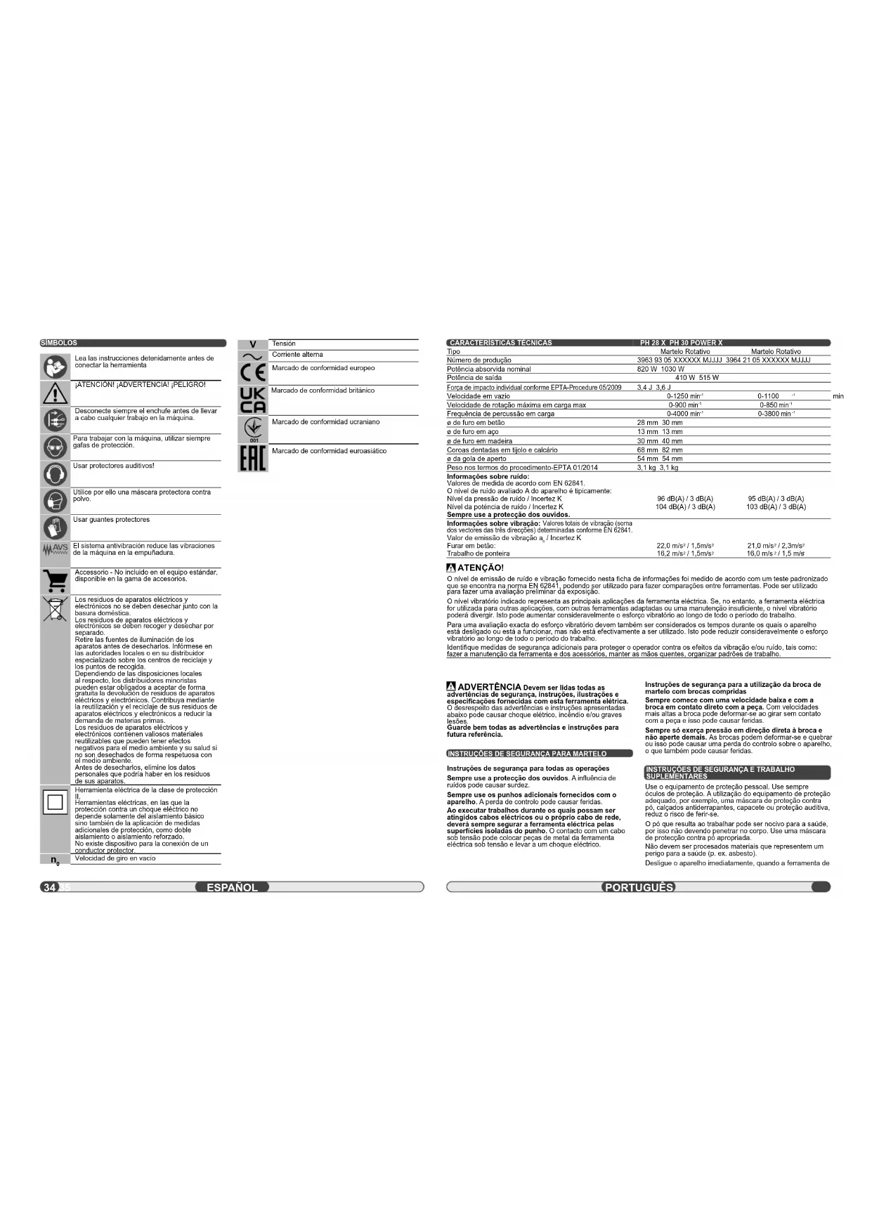Tensión Corriente alterna Marcado de conformidad europeo Marcado de conformidad británico Marcado de conformidad ucraniano Marcado de conformidad euroasiático ESPAÑOL Martelo Rotativo Martelo Rotativo PORTUGUÊS36 37 SYMBOLE Leia atentamente o manual de instruções antes de colocar a máquina em funcionamento. ATENÇÃO! PERIGO! Antes de efectuar qualquer intervenção na máquina, tirar a fi cha da tomada. Usar sempre óculos de protecção ao trabalhar com a máquina. Use protectores auriculares! Use uma máscara de protecção contra pó apropriada. Use luvas de protecção! O sistema anti-vibração reduz as vibrações da máquina na pega. Acessório - Não incluído no eqipamento normal, disponível como acessório. Resíduos de equipamentos elétricos e eletrónicos (EEE) não devem ser descartados com o lixo doméstico. EEE devem ser recolhidos e descartados separadamente. Remova as luzes antes de descartar os equipamentos. Informe-se sobre os centros de reciclagem e os postos de coleta nas autoridades locais ou no seu vendedor autorizado. Dependendo dos regulamentos locais, os retalhistas podem ser obrigados a retomar gratuitamente os resíduos de equipamentos elétricos e eletrónicos. Contribua a reduzir as necessidades de matérias-primas, reutilizando e reciclando os seus resíduos de equipamentos elétricos e eletrónicos. Resíduos de equipamentos elétricos e eletrónicos contém materiais valiosos e reutilizáveis que podem ter efeitos negativos para o meio ambiente e a sua saúde se não forem descartados ecologicamente. Apague eventuais dados pessoais existentes no seu resíduo de equipamento antes de descartá-lo. Ferramenta eléctrica da classe de protecção II. Ferramenta eléctrica, na qual a protecção contra choque eléctrico não só depende do isolamento básico, mas também da aplicação de medidas de protecção suplementares, como isolamento duplo ou reforçado. Não há um dispositivo para a conexão dum condutor de protecção.