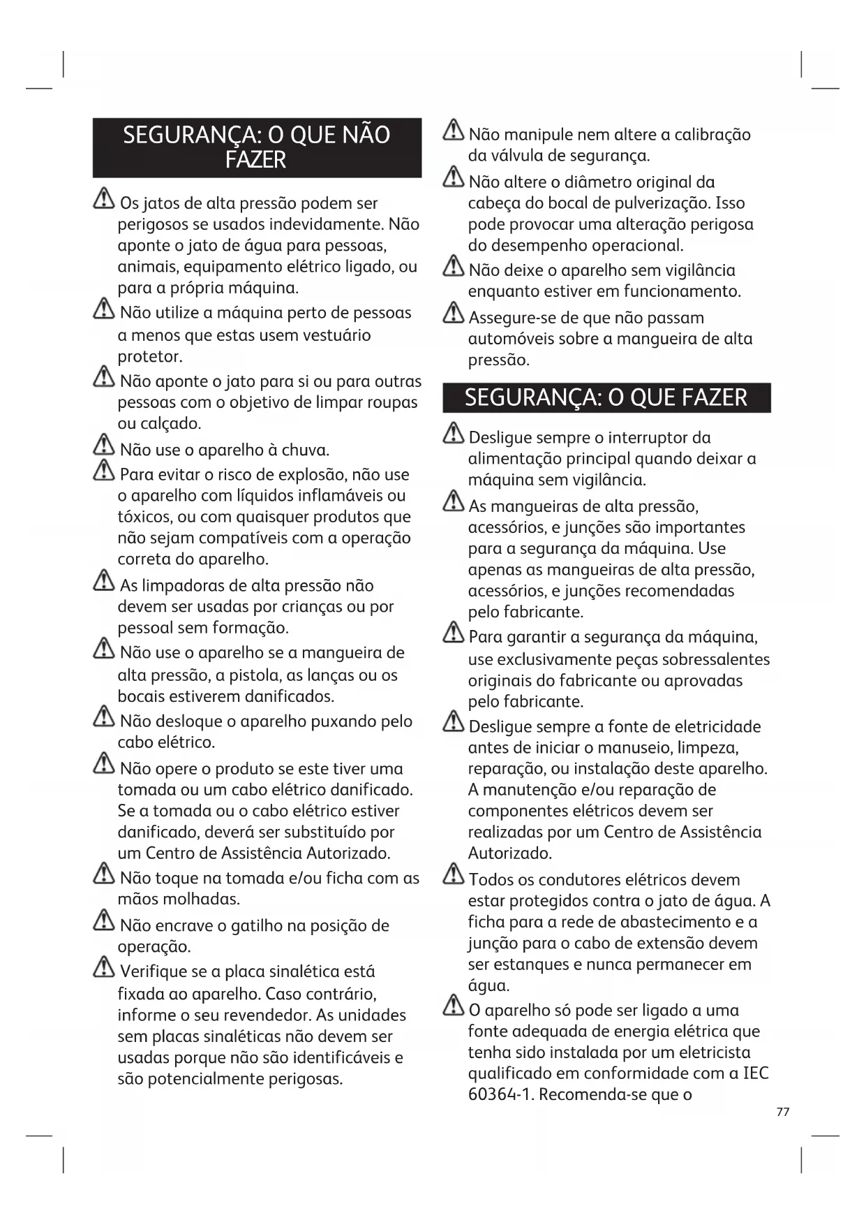 FAZER Os jatos de alta pressão podem ser perigosos se usados indevidamente. Não aponte o jato de água para pessoas, animais, equipamento elétrico ligado, ou para a própria máquina. Não utilize a máquina perto de pessoas a menos que estas usem vestuário protetor. Não aponte o jato para si ou para outras pessoas com o objetivo de limpar roupas ou calçado. Não use o aparelho à chuva. Para evitar o risco de explosão, não use o aparelho com líquidos inflamáveis ou tóxicos, ou com quaisquer produtos que não sejam compatíveis com a operação correta do aparelho. As limpadoras de alta pressão não devem ser usadas por crianças ou por pessoal sem formação. Não use o aparelho se a mangueira de alta pressão, a pistola, as lanças ou os bocais estiverem danificados. Não desloque o aparelho puxando pelo cabo elétrico. Não opere o produto se este tiver uma tomada ou um cabo elétrico danificado. Se a tomada ou o cabo elétrico estiver danificado, deverá ser substituído por um Centro de Assistência Autorizado. Não toque na tomada e/ou ficha com as mãos molhadas. Não encrave o gatilho na posição de operação. Verifique se a placa sinalética está fixada ao aparelho. Caso contrário, informe o seu revendedor. As unidades sem placas sinaléticas não devem ser usadas porque não são identificáveis e são potencialmente perigosas. Não manipule nem altere a calibração da válvula de segurança. Não altere o diâmetro original da cabeça do bocal de pulverização. Isso pode provocar uma alteração perigosa do desempenho operacional. Não deixe o aparelho sem vigilância enquanto estiver em funcionamento. Assegure-se de que não passam automóveis sobre a mangueira de alta pressão.