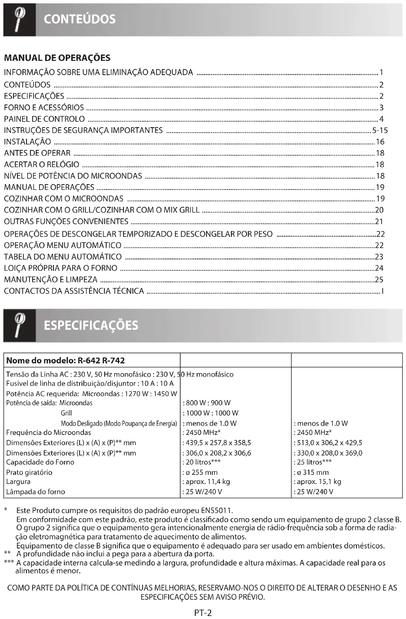 Nome do modelo: R-642 R-742 Tensão da Linha AC : 230 V, 50 Hz monofásico : 230 V, 50 Hz monofásicoFusível de linha de distribuição/disjuntor : 10 A : 10 APotência AC requerida: Microondas : 1270 W : 1450 WPotência de saída: Microondas: 800 W : 900 W Grill: 1000 W : 1000 W Modo Desligado (Modo Poupança de Energia): menos de 1.0 W : menos de 1.0 WFrequência do Microondas : 2450 MHz* : 2450 MHz* Dimensões Exteriores (L) x (A) x (P)** mm : 439,5 x 257,8 x 358,5 : 513,0 x 306,2 x 429,5 Dimensões Exteriores (L) x (A) x (P)** mm : 306,0 x 208,2 x 306,6 : 330,0 x 208,0 x 369,0 Capacidade do Forno : 20 litros*** : 25 litros***Prato giratório : ø 255 mm : ø 315 mmLargura : aprox. 11,4 kg : aprox. 15,1 kgLâmpada do forno : 25 W/240 V : 25 W/240 V