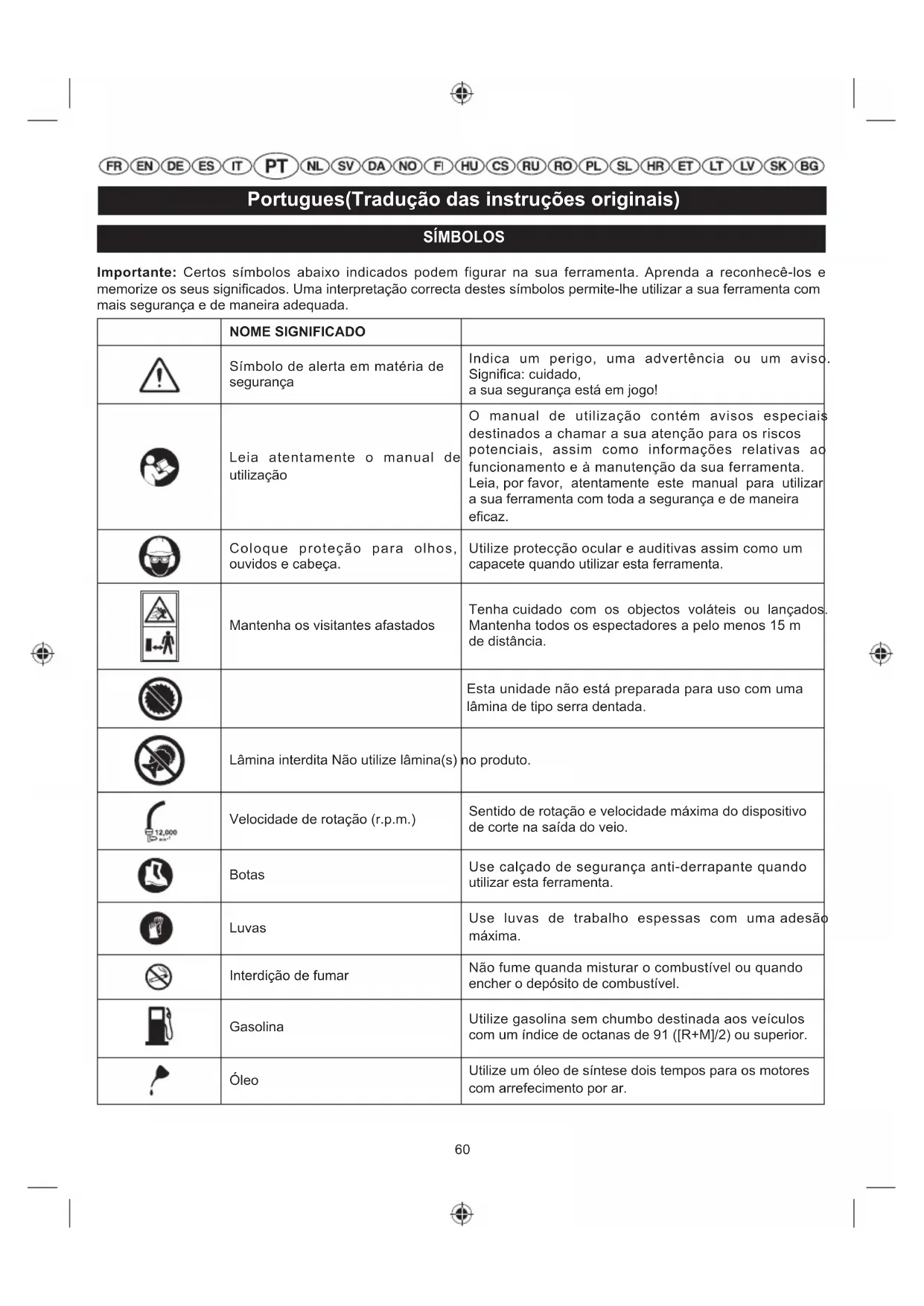 "Sostituzione e pulizia del filtro dell'aria".60 Portugues(Tradução das instruções originais) SÍMBOLOS Importante: Certos símbolos abaixo indicados podem figurar na sua ferramenta. Aprenda a reconhecê-los e memorize os seus significados. Uma interpretação correcta destes símbolos permite-lhe utilizar a sua ferramenta com mais segurança e de maneira adequada. NOME SIGNIFICADO Símbolo de alerta em matéria de segurança Indica um perigo, uma advertência ou um aviso. Significa: cuidado, a sua segurança está em jogo! Leia atentamente o manual de utilização O manual de utilização contém avisos especiais destinados a chamar a sua atenção para os riscos potenciais, assim como informações relativas ao funcionamento e à manutenção da sua ferramenta. Leia, por favor, atentamente este manual para utilizar a sua ferramenta com toda a segurança e de maneira eficaz. Coloque proteção para olhos, ouvidos e cabeça. Utilize protecção ocular e auditivas assim como um capacete quando utilizar esta ferramenta. Mantenha os visitantes afastados Tenha cuidado com os objectos voláteis ou lançados. Mantenha todos os espectadores a pelo menos 15 m de distância. Esta unidade não está preparada para uso com uma lâmina de tipo serra dentada Lâmina interdita Não utilize lâmina(s) no produto. Velocidade de rotação (r.p.m.) Sentido de rotação e velocidade máxima do dispositivo de corte na saída do veio. Botas Use calçado de segurança anti-derrapante quando utilizar esta ferramenta. Luvas Use luvas de trabalho espessas com uma adesão máxima. Interdição de fumar Não fume quanda misturar o combustível ou quando encher o depósito de combustível. Gasolina Utilize gasolina sem chumbo destinada aos veículos com um índice de octanas de 91 ([R+M]/2) ou superior. Óleo Utilize um óleo de síntese dois tempos para os motores com arrefecimento por ar.61 Portugues(Tradução das instruções originais) Mistura gasolina + óleo Misture bem o combustível antes de cada enchimento do depósito. Interruptor Interruptor Ligar/Desligar I = funcionamento O = paragem Mantenha as mãos afastadas das lâminas. Posição de funcionamento Defina a alavanca de controlo para a posição de “FULL”. Defina a alavanca de controlo para a posição de “HALF”. Coloque o interruptor de ignição na posição «I» (ON), ligado. Pressione o cartucho principal 10 vezes. Puxe a alça de arranque para iniciar o motor. Deslize o bloqueio do acelerador e o gatilho do acelerador para arrancar o motor. Tempo de espera 10 segundos Para parar o motor, coloque o interruptor de ignição na posição “O” de paragem . Esta ferramenta obedece a todas as normas regulamentares do país da UE onde foi comprada. Marca de conformidade EurAsian. Marca de conformidade ucraniana As seguintes palavras de sinal e significados destinam-se a explicar os níveis de risco associados a este produto.
