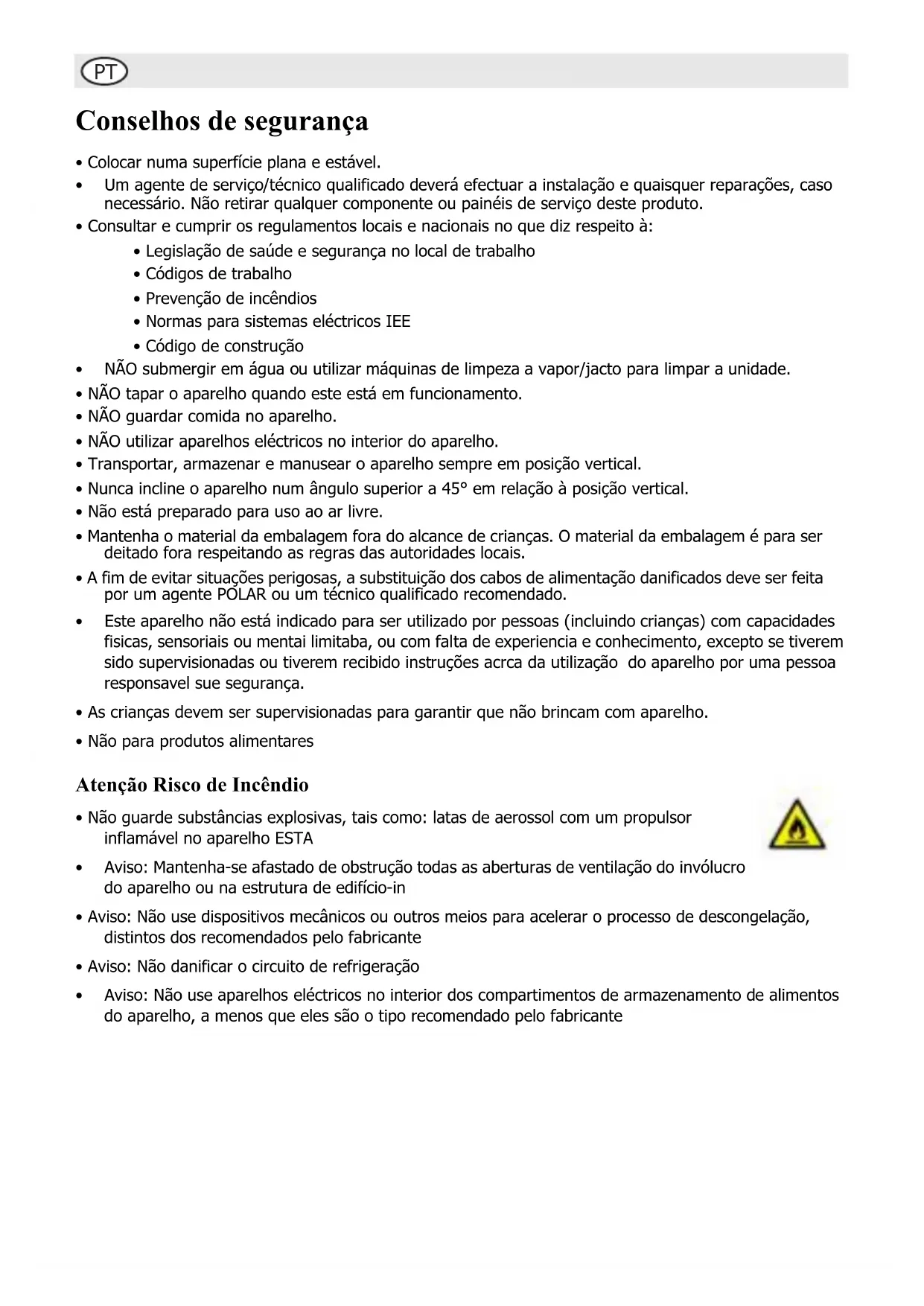 - Não para produtos alimentares Atenção Risco de Incêndio