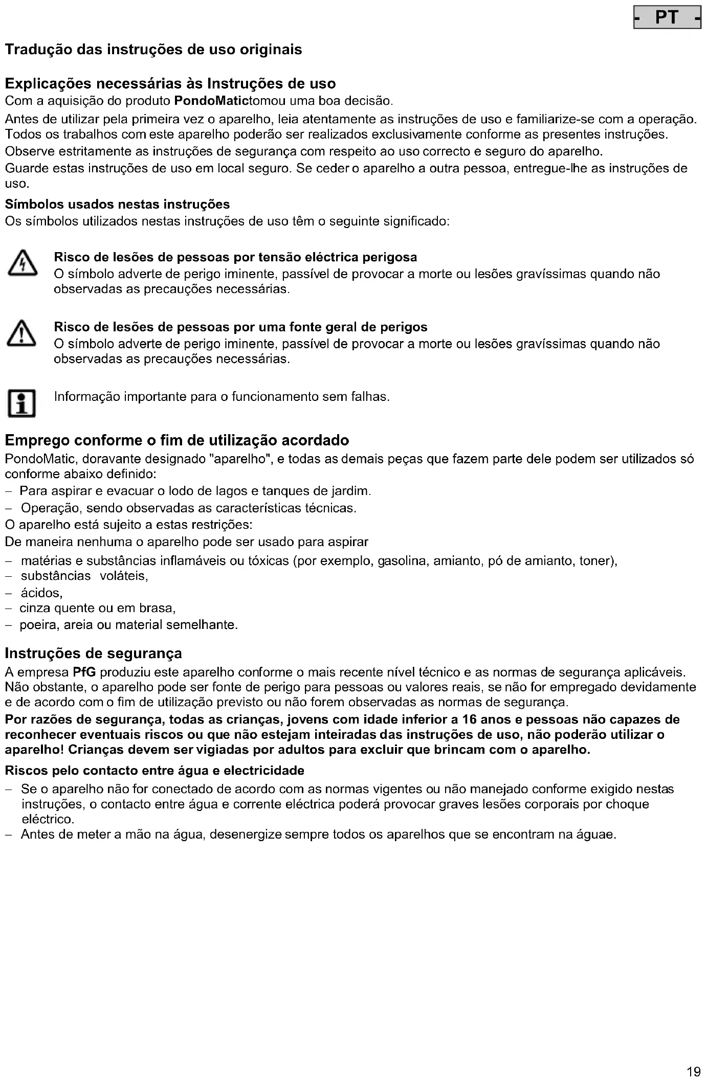 A Empresa PfG produziu este aparelho conforme o mais recente nível专业技术 e as normas de segurarca aplicaveis. Não obstarve, o aparelho pode ser fonte de perigo para pessoas ou价值观es reais, se não for empregado devidamente e de acordo com o fim de uso previsto ou não forem observadas as normas de segurarca.