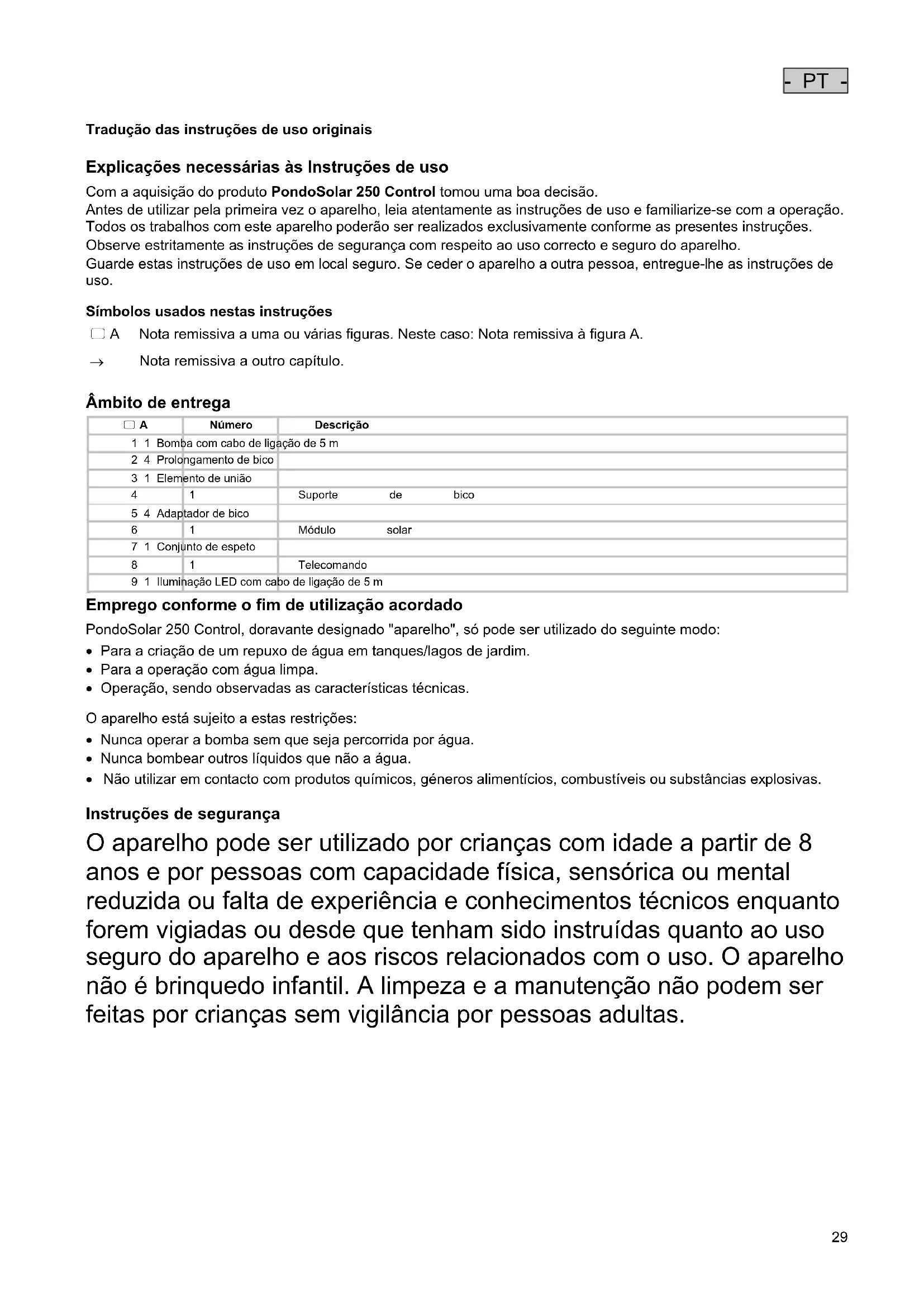 Emprego conforme o fim de utilização acordado PondoSolar 250 Control, doravante designado "aparelho", só pode ser utilizado do seguinte modo: Para a criação de um repuxo de água em tanques/lagos de jardim. Para a operação com água limpa. Operação, sendo observadas as características técnicas.