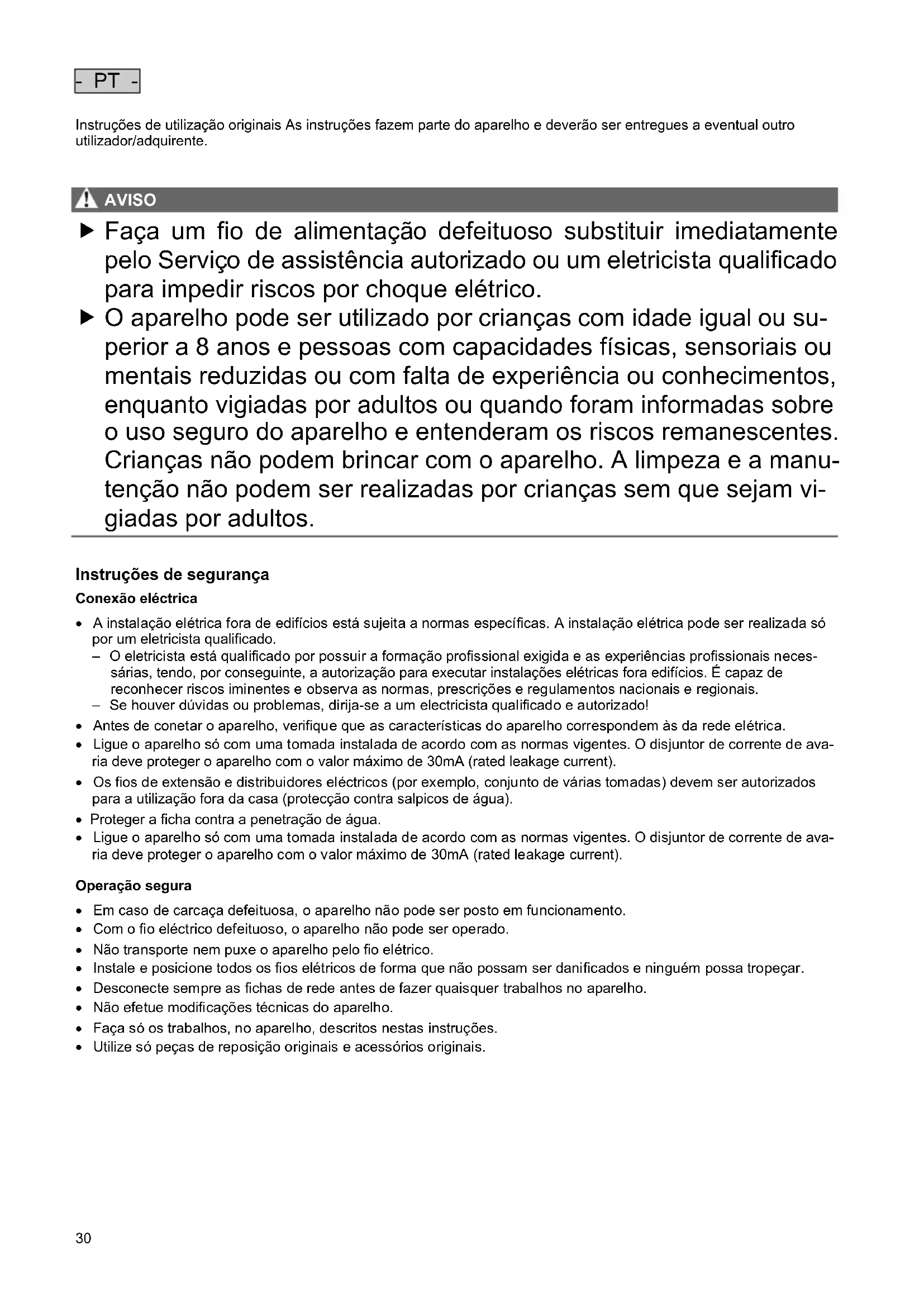 - PT - Instruções de utilização originais As instruções fazem parte do aparelho e deverão ser entregues a eventual outro utilizador/adquirente.