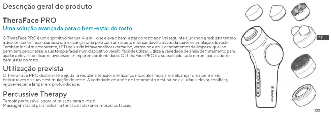 Descrição geral do produto TheraFace PRO Uma solução avançada para o bem-estar do rosto. O TheraFace PRO é um dispositivo manual 4-em-1 que eleva o bem-estar do rosto ao nível seguinte ajudando a reduzir a tensão, a descontrair os músculos faciais, e a alcançar uma pele com um aspeto mais saudável através da suave estimulação do rosto. Também inclui microcorrente, LED de luz de infravermelhos+vermelho, vermelho e azul, e tratamentos de limpeza, que lhe permitem personalizar a sua terapia facial num dispositivo versátil fácil de utilizar. Utilize a variedade de anéis de tratamento para ajudar a elevar, tonicar, rejuvenescer e limpar em profundidade. O TheraFace PRO é a sua solução tudo em um para saúde e bem-estar do rosto. Utilização prevista Percussive Therapy O TheraFace PRO destina-se a ajudar a reduzir a tensão, a relaxar os músculos faciais, e a alcançar uma pele mais bela através da suave estimulação do rosto. A variedade de anéis de tratamento destina-se a ajudar a elevar, tonicar, rejuvenescer e limpar em profundidade. Terapia percussiva, agora otimizada para o rosto. Massagem facial para reduzir a tensão e relaxar os músculos faciais123