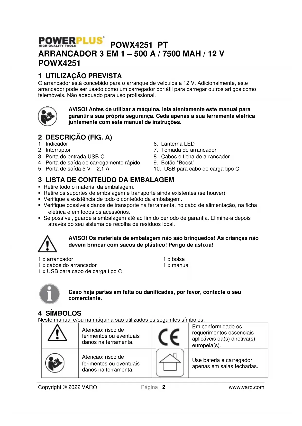 5 V / 3 A, 9 V / 2 A 5 V / 2,1 A 12 V Corrente inicial 200 A Corrente de pico 500 A Desligamento automático Sim Temperaturas de operação -20 °C ~ 60 °C 9 MEIO-AMBIENTE Se a sua máquina necessitar de ser substituída após uma utilização prolongada, não a coloque no lixo doméstico. Elimine-a de uma forma ecologicamente segura. O lixo produzido pelas máquinas elétricas não pode ser eliminado com o lixo doméstico normal. Faça a reciclagem onde existam instalações adequadas. Consulte as autoridades locais ou o seu revendedor para conselhos sobre a recolha e a eliminação.POWX4251 PT Copyright © 2022 VARO Página | 8 www.varo.com