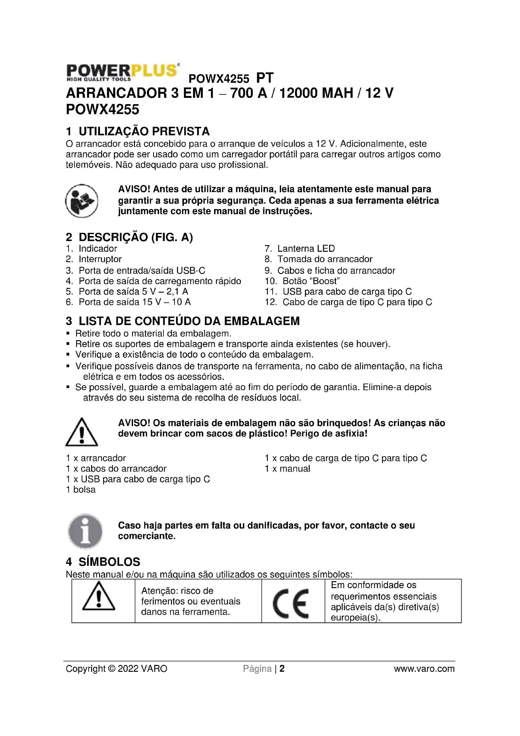 - Arrancador para veículos a 12 V, seria um perigo para outros arrancadores.POWX4255 PT Copyright © 2022 VARO Página | 5 www.varo.com