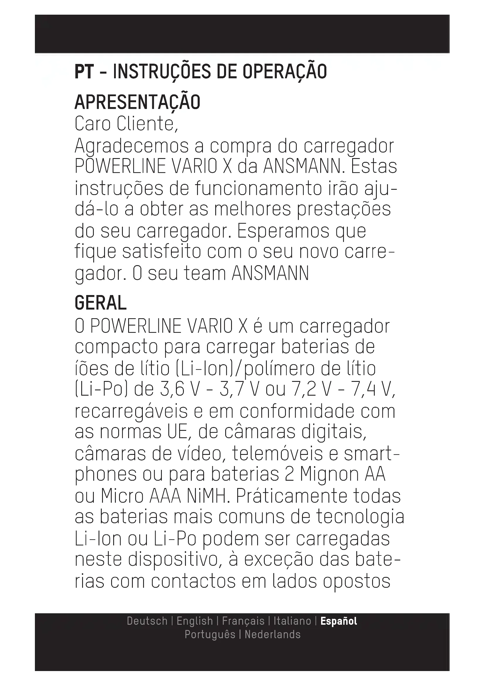 Por la presente, le ofrecemos una garantía de 3 años en este cargador. Esto no se aplica a los daños causados por: baterías de baja calidad con fugas dentro del cargador, el incumplimiento de las instrucciones de funcionamiento o daños materiales debido a la falta de cuidado. Detalles técnicos sujetos a cambios sin previo aviso. No nos hacemos respons- ables por errores tipográficos u omisio- nes. 08/2018 Deutsch | English | Français | Italiano | Español Português | NederlandsPT - INSTRUÇÕES DE OPERAÇÃO APRESENTAÇÃO Caro Cliente, Agradecemos a compra do carregador POWERLINE VARIO X da ANSMANN. Estas instruções de funcionamento irão aju- dá-lo a obter as melhores prestações do seu carregador. Esperamos que fique satisfeito com o seu novo carre- gador. O seu team ANSMANN GERAL O POWERLINE VARIO X é um carregador compacto para carregar baterias de íões de lítio (Li-Ion)/polímero de lítio (Li-Po) de 3,6 V - 3,7 V ou 7,2 V - 7,4 V, recarregáveis e em conformidade com as normas UE, de câmaras digitais, câmaras de vídeo, telemóveis e smart- phones ou para baterias 2 Mignon AA ou Micro AAA NiMH. Práticamente todas as baterias mais comuns de tecnologia Li-Ion ou Li-Po podem ser carregadas neste dispositivo, à exceção das bate- rias com contactos em lados opostos Deutsch | English | Français | Italiano | Español Português | Nederlandsou com os contactos muito profundos. Um microprocessador automáticamente supervision o processo de carga. Para uma ótima performance, recomenda- mos a utilização de baterias recarregá- veis ANSMANN. INCLUI arregador POWERLINE VARIO X Cabo de carregamento com ficha USB Manual de instruções