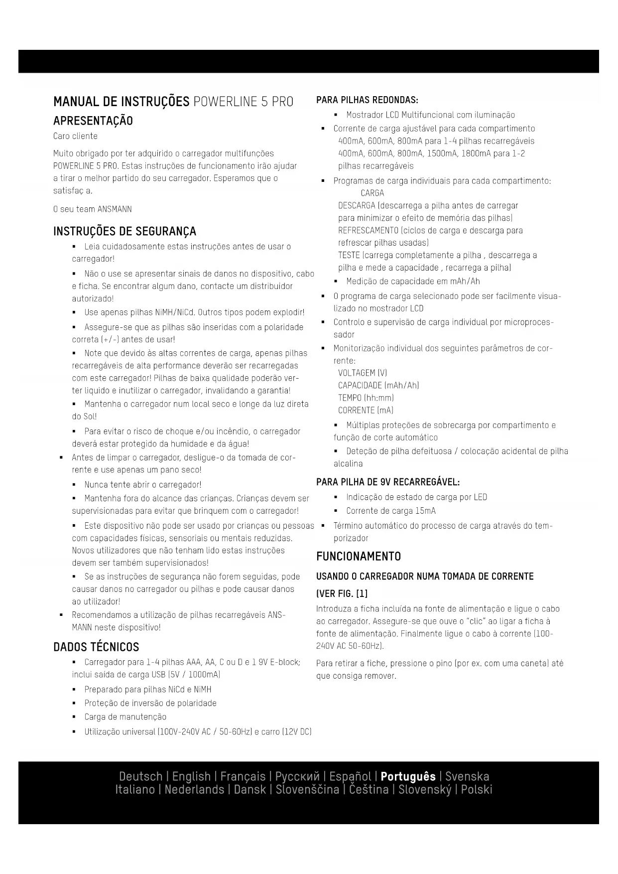 Voltagem de entrada na fonte de alimentação: 100-240V AC / 50-60Hz Voltagem de entrada no automóvel: 12V DC Voltagem de entrada no carregador:12V DC Corrente de carga para pilhas redondas: 400mA – 1800mA Corrente de carga para pilhas de 9V: 15mA Capacidade máxima de carga: 11000mAh para pilhas redondas 300mAh para pilha 9V Tomada de carga USB: 5V / 1000mA AVISO LEGAL As informações neste manual podem ser alteradas sem aviso prévio. A ANSMANN não aceita qualquer responsabilidade por danos diretos, indiretos, acidentais ou qualquer outro, se não usar este carregador como descrito neste manual de instruções. Perdas consequentes não serão aceites. GARANTIA A ANSMANN oferece 3 anos de garantia neste carregador. Esta não se aplica aos danos causados por: líquido vertido por pilhas de baixa Qualidade dentro do carregador, não cumprimento das instruções de funcionamento ou danos físicos causados por falta de cuidado. Detalhes técnicos sujeitos a alterações sem aviso prévio. Não as- sumimos responsabilidades por erros ortográficos ou omissões. 02/2016 Deutsch | English | Français | Pусский | Español | Português | Svenska Italiano | Nederlands | Dansk | Slovenščina | Čeština | Slovenský | PolskiINSTRUKTIONSMANUAL POWERLINE 5 PRO FÖRORD Bäste kund, Tack för att ni valt en POWERLINE 5 PRO laddare från ANSMANN. Dessa användar instruktioner kommer hjälpa er att få ut maximalt av er POWERLINE 5 PRO. Vänligen läs dessa instruktioner nog- grannt före användning. Vi hoppas ni skall bli nöjda med er nya laddare. Ert ANSMANN Team