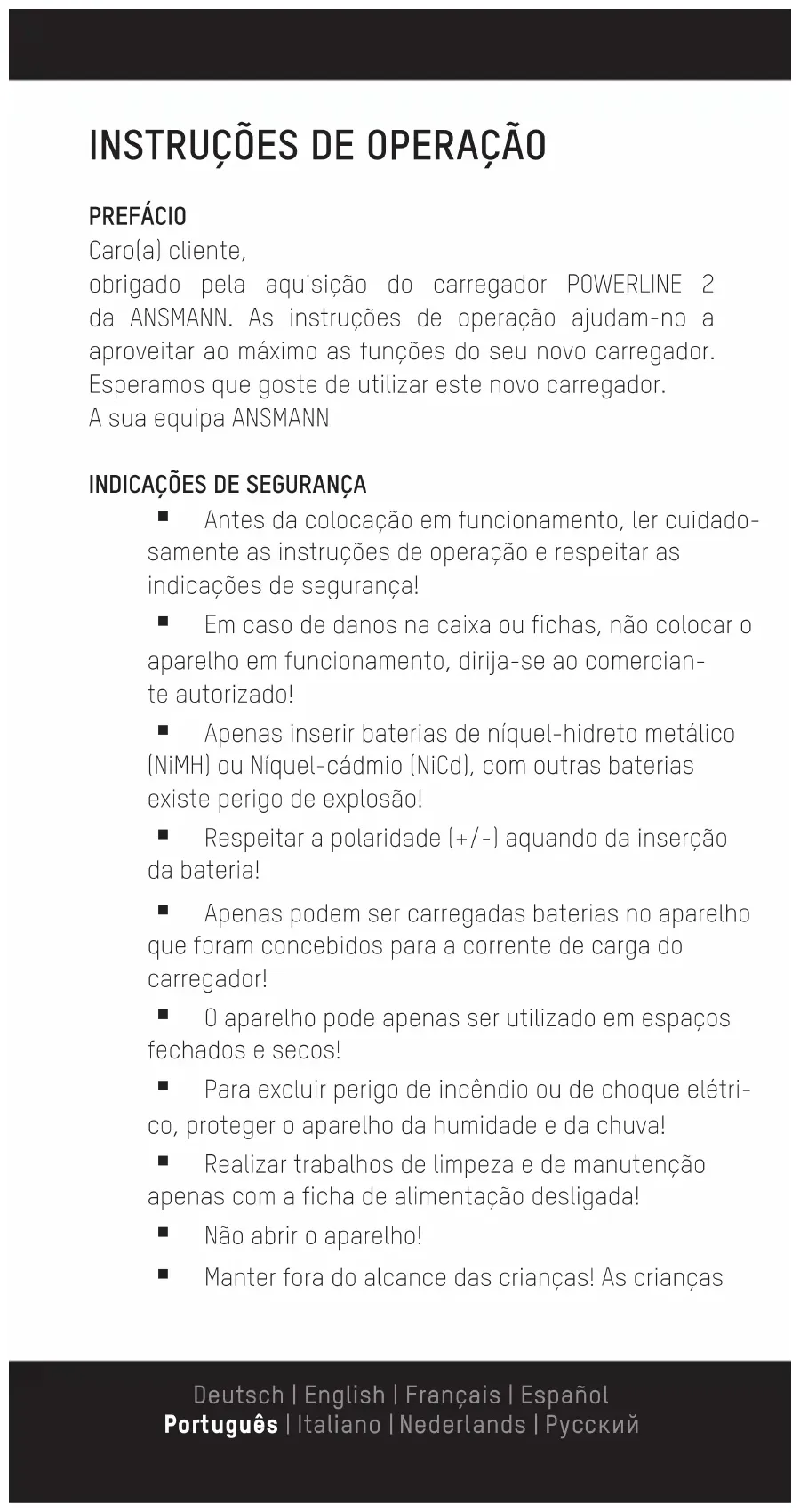 Antes da colocação em funcionamento, ler cuidado- samente as instruções de operação e respeitar as indicações de segurança! Em caso de danos na caixa ou fichas, não colocar o aparelho em funcionamento, dirija-se ao comercian- te autorizado! Apenas inserir baterias de níquel-hidreto metálico (NiMH) ou Níquel-cádmio (NiCd), com outras baterias existe perigo de explosão! Respeitar a polaridade (+/-) aquando da inserção da bateria! Apenas podem ser carregadas baterias no aparelho que foram concebidos para a corrente de carga do carregador! O aparelho pode apenas ser utilizado em espaços fechados e secos! Para excluir perigo de incêndio ou de choque elétri- co, proteger o aparelho da humidade e da chuva! Realizar trabalhos de limpeza e de manutenção apenas com a ficha de alimentação desligada! Não abrir o aparelho! Manter fora do alcance das crianças! As crianças Deutsch | English | Français | Español Português | Italiano | Nederlands | PусскийDeutsch | English | Français | Español Português | Italiano | Nederlands | Pусский devem ser supervisionadas para garantir que não brincam com o aparelho! Este aparelho não se destina à utilização por pes- soas (incluindo crianças) que apresentem capacida- des físicas, sensoriais ou mentais diminuídas ou não possuam experiência e conhecimento relativamente ao manuseamento deste aparelho. Tais pessoas devem ser, em primeiro lugar, instruídas por um supervisor responsável pela sua segurança e super- visionadas durante a operação do aparelho! A inobservância das indicações de segurança pode causar danos no aparelho, na bateria ou ferimentos graves! Recomendamos a utilização da bateria da ANSMANN!