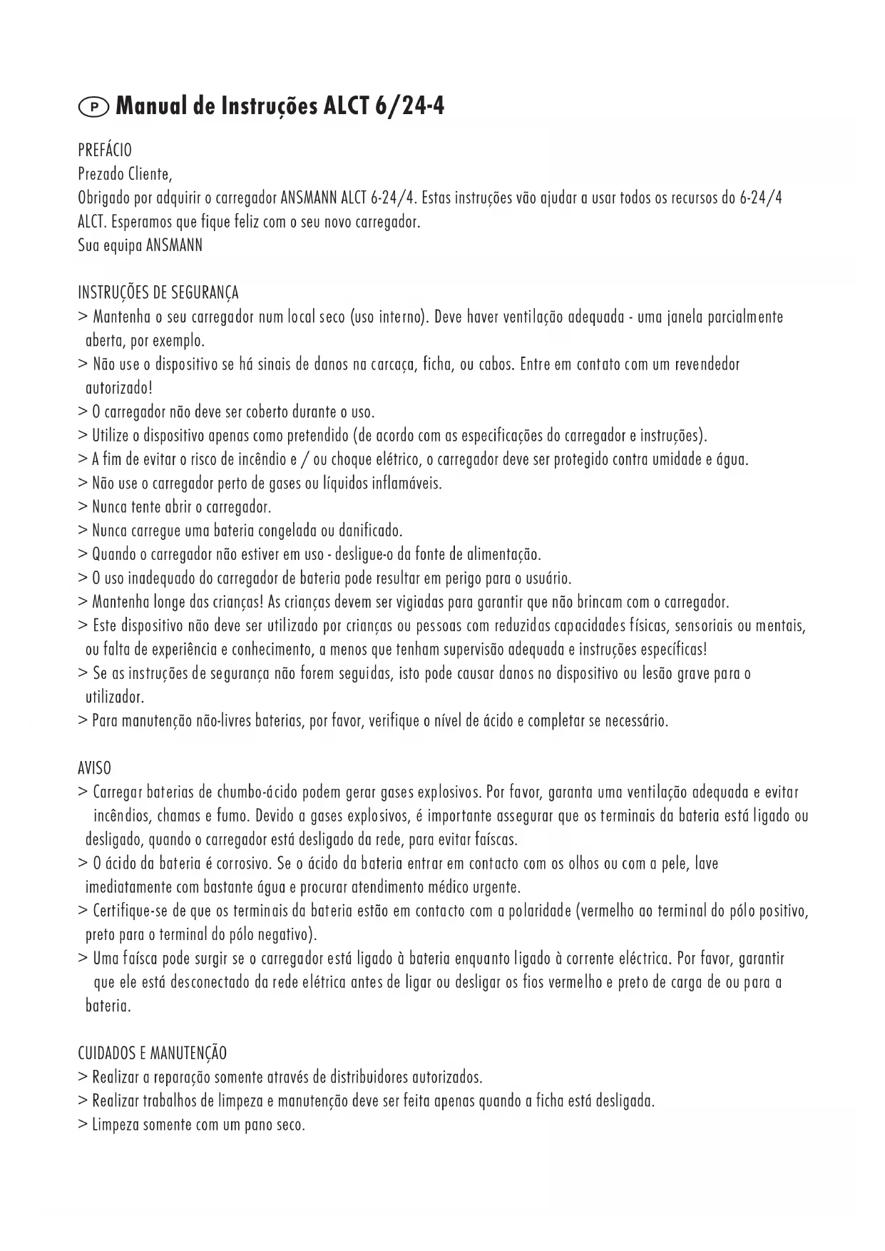 Alternativamente, a bateria pode ser deixada ligada durante um período prolongado (por exemplo, para o inverno). O carregador detecta qualquer perda de capacidade e recarrega automaticamente. ESPECIFICAÇÕES Tensão de entrada de 230V AC / 50Hz Classe de protecção II proteção IP65 Carga de tensão: 6V 7,25 V / 12V: 14,5 V / 24V: 29,0 V Carregue TEMP COLD tensão. 6V: 7,45 V / 12V: 14,9 V / 24V: 29,8 V Ajustáveis correntes de carga 1A / 2A / 4A A capacidade da bateria 4,5 Ah - 160Ah ISENÇÕES As informações contidas neste manual podem ser alterados sem aviso prévio. A ANSMANN não assume qualquer respon- sabilidade por quaisquer danos diretos, indiretos, incidentais ou consequenciais ou quaisquer outros danos causados por manuseio inadequado ou desrespeito das informações contidas neste manual.