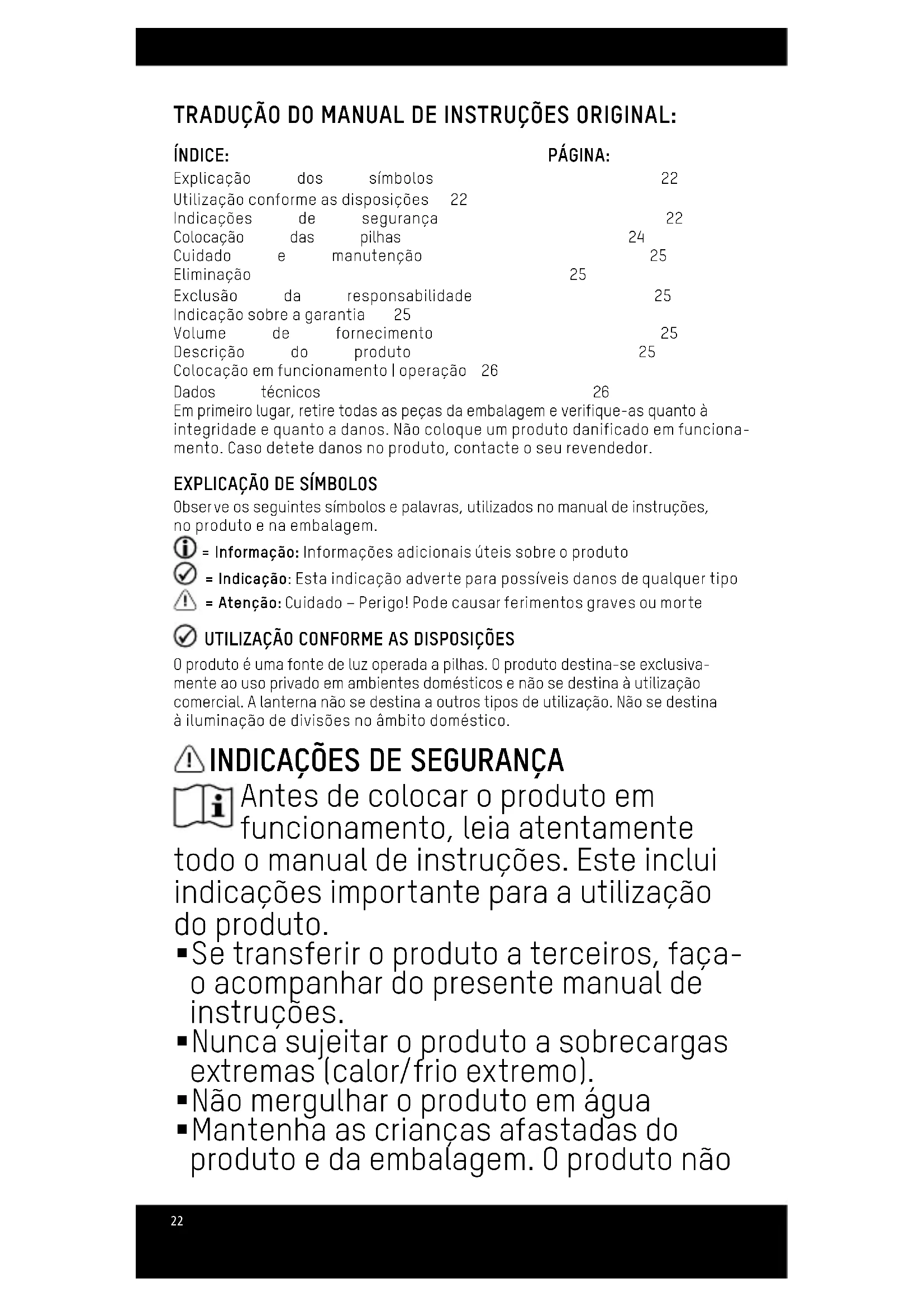 Lámpara: Lámpara principal: LED SMD de 3W / luz adicional: LED SMD de 1W Grupo de riesgo: 1 Suministro de cor- riente : 2 pilas micro AAA alcalinas LR03 (contenidas en el volumen de suministro) Clase de protección: III Flujo luminoso: Lámpara principal: 130 lm | luz adicional: 50 lm Duración de la ilumi- nación: Lámpara principal: aprox. 6 h | luz adicional: aprox. 7 h Alcance del haz de luz: Lámpara principal: aprox. 16 m | luz adicional: aprox. 12 m LED: 5700k | CRI >80 Material de la carcasa: Material sintético ABS Tipo de protección: IP20 | IK07 Temperatura de alma- cenamiento: de -10 a 50 °C Temperatura de servicio: de -10 a 40 °C Peso: 20g (sin pilas) Dimensiones: 160 x 20 x 15mm El producto observa las exigencias de las directivas de la UE . Reservado el derecho a introducir cambios técnicos. No aceptamos ninguna responsabilidad por errores de impresión.22 TRADUÇÃO DO MANUAL DE INSTRUÇÕES ORIGINAL: ÍNDICE: PÁGINA: Explicação dos símbolos 22 Utilização conforme as disposições 22 Indicações de segurança 22 Colocação das pilhas 24 Cuidado e manutenção 25 Eliminação 25 Exclusão da responsabilidade 25 Indicação sobre a garantia 25 Volume de fornecimento 25 Descrição do produto 25 Colocação em funcionamento | operação 26 Dados técnicos 26 Em primeiro lugar, retire todas as peças da embalagem e verifique-as quanto à integridade e quanto a danos. Não coloque um produto danificado em funciona- mento. Caso detete danos no produto, contacte o seu revendedor.