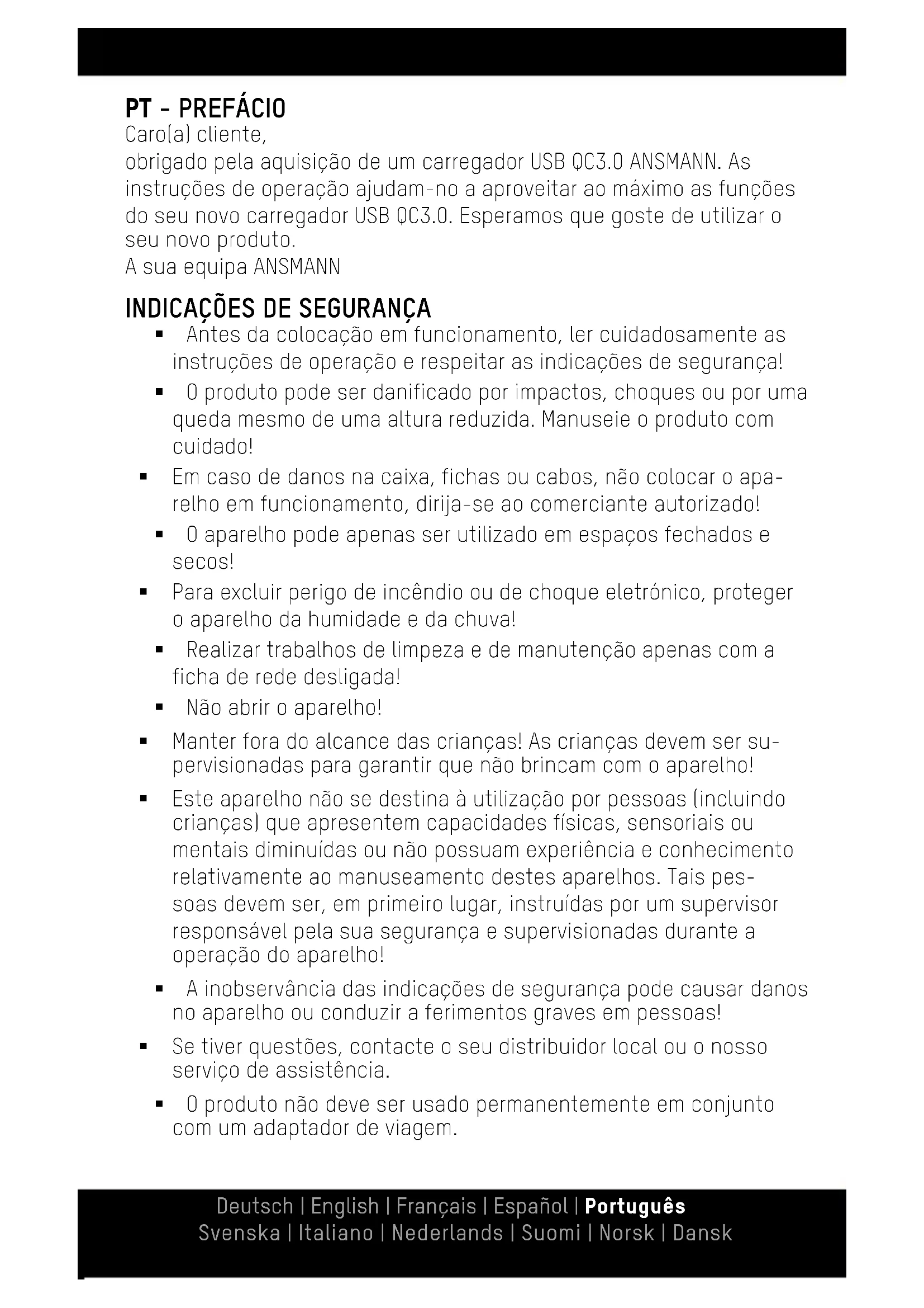 Antes da colocação em funcionamento, ler cuidadosamente as instruções de operação e respeitar as indicações de segurança! O produto pode ser danificado por impactos, choques ou por uma queda mesmo de uma altura reduzida. Manuseie o produto com cuidado! Em caso de danos na caixa, fichas ou cabos, não colocar o apa- relho em funcionamento, dirija-se ao comerciante autorizado! O aparelho pode apenas ser utilizado em espaços fechados e secos! Para excluir perigo de incêndio ou de choque eletrónico, proteger o aparelho da humidade e da chuva! Realizar trabalhos de limpeza e de manutenção apenas com a ficha de rede desligada! Não abrir o aparelho! Manter fora do alcance das crianças! As crianças devem ser su- pervisionadas para garantir que não brincam com o aparelho! Este aparelho não se destina à utilização por pessoas (incluindo crianças) que apresentem capacidades físicas, sensoriais ou mentais diminuídas ou não possuam experiência e conhecimento relativamente ao manuseamento destes aparelhos. Tais pes- soas devem ser, em primeiro lugar, instruídas por um supervisor responsável pela sua segurança e supervisionadas durante a operação do aparelho! A inobservância das indicações de segurança pode causar danos no aparelho ou conduzir a ferimentos graves em pessoas! Se tiver questões, contacte o seu distribuidor local ou o nosso serviço de assistência. O produto não deve ser usado permanentemente em conjunto com um adaptador de viagem. Deutsch | English | Français | Español | Português Svenska | Italiano | Nederlands | Suomi | Norsk | DanskCOLOCAÇÃO EM FUNCIONAMENTO CARREGAR APARELHOS Para carregar um aparelho, como p. ex. um Smartphone, utilize um cabo USB QC3.0 adequado ou o cabo de carregamento original do seu aparelho. O carregador USB QC3.0 possui uma saída de USB-A. Utilize para tal um cabo adequado. Insira a ficha USB do cabo no carregador USB QC3.0 e a outra extremidade no seu aparelho. O processo de carregamento inicia automaticamente. O carregador USB QC3.0 dispõe de USB e de um protocolo Qualcomm Quick Charge (QC3.0). De modo a utilizar esta tecnologia, verifique se o seu terminal é compatível. O carregamento simultâneo de vários terminais é possível de forma limitada. Isto é dependente da corrente de carga total e da tensão de carga necessárias. O carregador USB QC3.0 desliga-se automaticamente após um car- regamento bem sucedido. Desconecte o seu aparelho do carregador USB QC3.0 após um processo de carregamento. Dependendo da potência de saída necessária, o carregador USB QC3.0 pode aquecer ligeiramente. FUNCIONAMENTO INDICAÇÃO-TENSÃO DE REDE DE 110-240V O carregador USB QC3.0 é adequado para uma tensão de rede de 100-240V e, por isso, pode ser utilizado em todo o mundo. Tenha em atenção que pode ser necessário um adaptador específico do país. INDICAÇÃO Deteção automática: sem necessidade de ajustes ou alterações manuais, sendo apenas importantes os componentes certos (o cabo e o terminal devem ser compatíveis com QC3.0). Dado a quantidade extrema de diversos terminais QC3.0 e respetivas versões de software/firmware, pode acontecer que a função não seja detetada ou suportada sem problemas e na íntegra. Os terminais cujos carregadores originais requeiram mais de 18W de potência nominal de saída, serão carregados de forma mais lenta com este carregador.AVISO É importante que todos os terminais a carregar por USB QC3.0 sejam adequados para o protocolo QC3.0. Certifique-se que o seu terminal (Smartphone, tablet, notebook, consola ou outras aplicações) é adequado para uma das tensões de saída de 5V/9V/12V. CUIDADO Desligue o aparelho da corrente antes de o limpar e caso este não seja usado durante períodos longos. Limpe o carregador apenas com panos secos e macios.