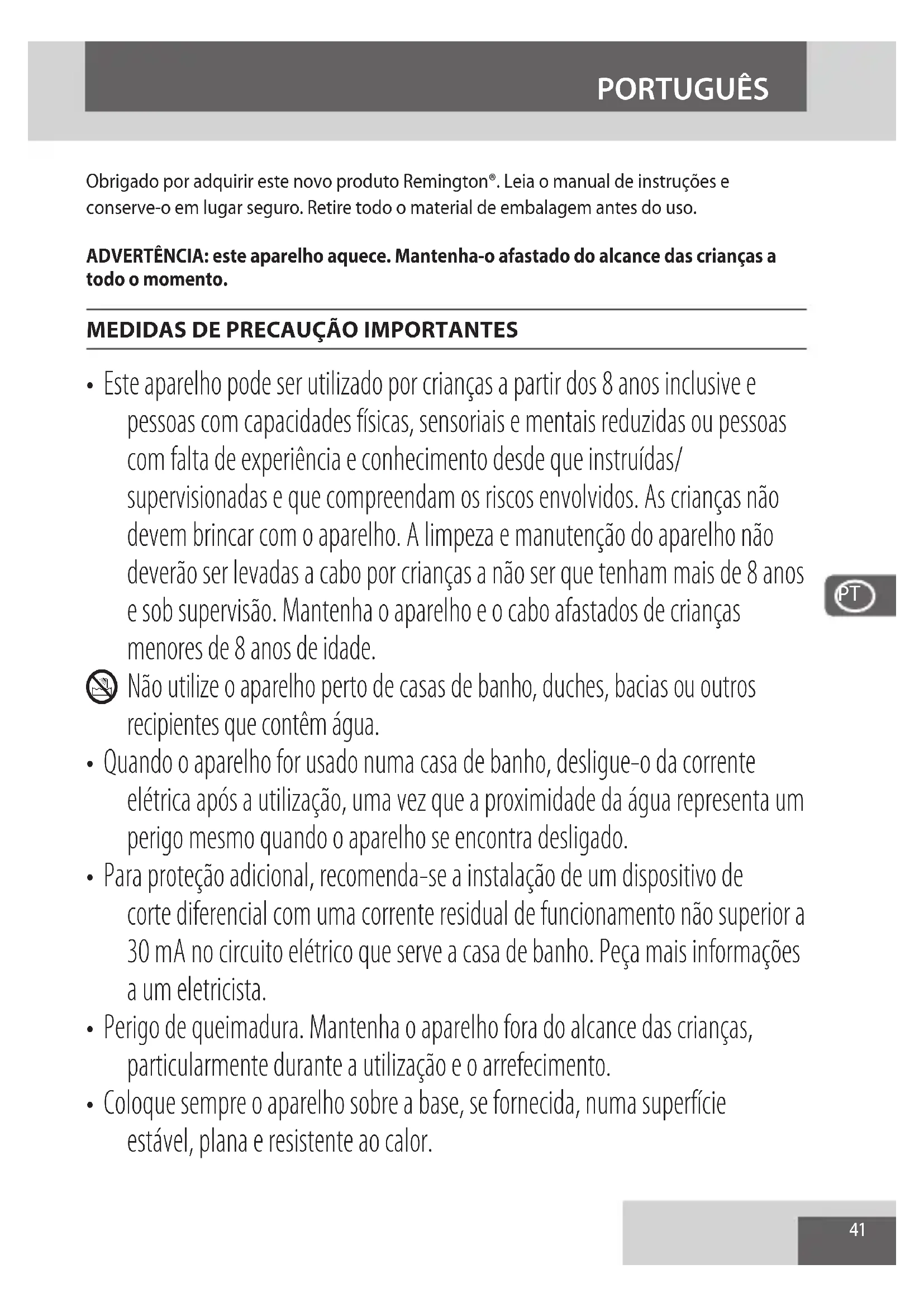 - Este aparelho pode ser utilizado por crianças a partir dos 8 anos inclusive e pessoas com capacidades físicas, sensoriais e mentais reduzidas ou pessoas com falta de experiência e conhecimento desde que instruídas/ supervisionadas e que compreendam os riscos envolvidos. As crianças não devem brincar com o aparelho. A limpeza e manutenção do aparelho não deverão ser levadas a cabo por crianças a não ser que tenham mais de 8 anos e sob supervisão. Mantenha o aparelho e o cabo afastados de crianças menores de 8 anos de idade. L Não utilize o aparelho perto de casas de banho, duches, bacias ou outros recipientes que contêm água.