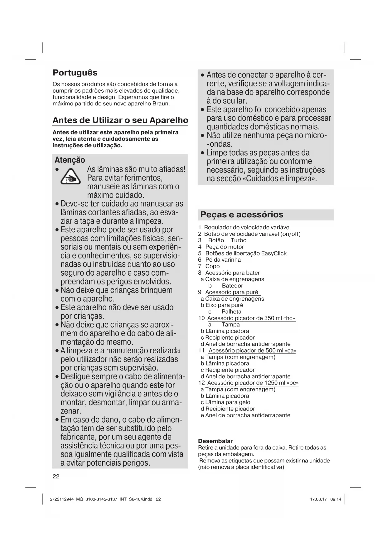 Limpe todas as peças antes da primeira utilização ou conforme necessário, seguindo as instruções na secção «Cuidados e limpeza». Peças e acessórios 1 Regulador de velocidade variável 2 Botão de velocidade variável (on/off) 3 Botão Turbo 4 Peça do motor 5 Botões de libertação EasyClick 6 Pé da varinha 7 Copo 8 Acessório para bater a Caixa de engrenagens b Batedor 9 Acessório para puré a Caixa de engrenagens b Eixo para puré c Palheta 10 Acessório picador de 350 ml «hc» a Tampa b Lâmina picadora c Recipiente picador d Anel de borracha antiderrapante 11 Acessório picador de 500 ml «ca» a Tampa (com engrenagem) b Lâmina picadora c Recipiente picador d Anel de borracha antiderrapante 12 Acessório picador de 1250 ml «bc» a Tampa (com engrenagem) b Lâmina picadora c Lâmina para gelo d Recipiente picador e Anel de borracha antiderrapante Desembalar Retire a unidade para fora da caixa. Retire todas as peças da embalagem. Remova as etiquetas que possam existir na unidade (não remova a placa identificativa). 5722112944_MQ_3100-3145-3137_INT_S6-104.indd 225722112944_MQ_3100-3145-3137_INT_S6-104.indd 22 17.08.17 09:1417.08.17 09:1423 Como utilizar o aparelho Ajustar a velocidade Ao ativar o botão de velocidade variável (2), a velocidade de processamento corresponde ao ajuste do regulador de velocidade variável (1). Quanto mais alto for o ajuste, mais rápidos são os resultados do picador. Pode ajustar facilmente a velocidade durante o funcionamento rodando o regulador de velocidade. A velocidade de processamento máxima pode ser atingida pressionando o botão Turbo (3). Também pode utilizar o botão Turbo para potentes impulsos instantâneos, sem ter de manipular o regulador de velocidade. Eixo de mistura (A) A varinha mágica adequa-se perfeitamente à preparação de pastas, molhos, molhos para salada, sopas, alimentos para bebés, assim como bebidas, smoothies e batidos de leite. Para obter os melhores resultados, use a velocidade Turbo. Montagem e operação