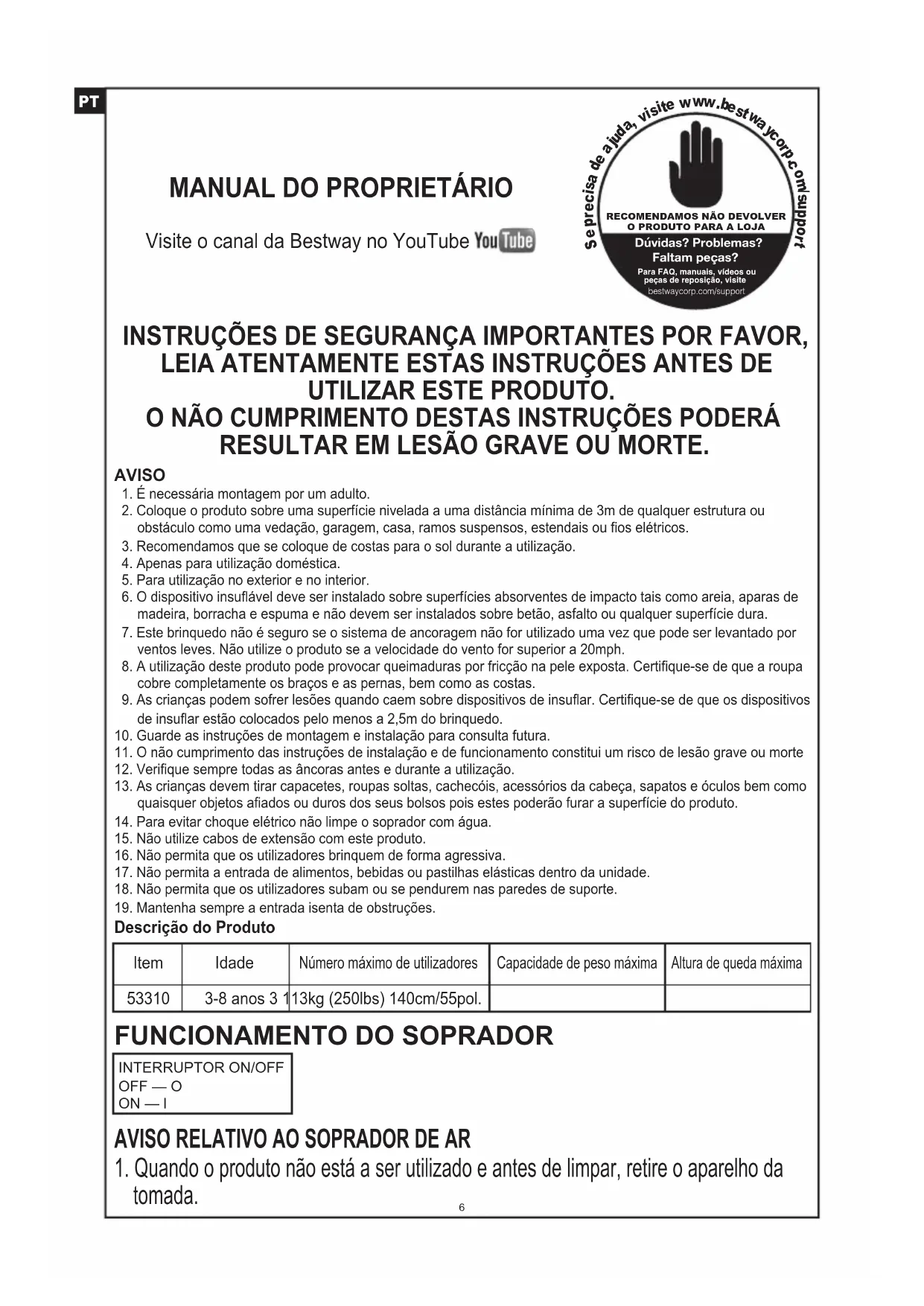 DO ALCANCE DE CRIANÇAS.INSTRUÇÕES DE SEGURANÇA IMPORTANTES POR FAVOR, LEIA ATENTAMENTE ESTAS INSTRUÇÕES ANTES DE UTILIZAR ESTE PRODUTO. O NÃO CUMPRIMENTO DESTAS INSTRUÇÕES PODERÁ RESULTAR EM LESÃO GRAVE OU MORTE. AVISO 1. É necessária montagem por um adulto. 2. Coloque o produto sobre uma superfície nivelada a uma distância mínima de 3m de qualquer estrutura ou obstáculo como uma vedação, garagem, casa, ramos suspensos, estendais ou fios elétricos. 3. Recomendamos que se coloque de costas para o sol durante a utilização. 4. Apenas para utilização doméstica. 5. Para utilização no exterior e no interior. 6. O dispositivo insuflável deve ser instalado sobre superfícies absorventes de impacto tais como areia, aparas de madeira, borracha e espuma e não devem ser instalados sobre betão, asfalto ou qualquer superfície dura. 7. Este brinquedo não é seguro se o sistema de ancoragem não for utilizado uma vez que pode ser levantado por ventos leves. Não utilize o produto se a velocidade do vento for superior a 20mph. 8. A utilização deste produto pode provocar queimaduras por fricção na pele exposta. Certifique-se de que a roupa cobre completamente os braços e as pernas, bem como as costas. 9. As crianças podem sofrer lesões quando caem sobre dispositivos de insuflar. Certifique-se de que os dispositivos de insuflar estão colocados pelo menos a 2,5m do brinquedo.10. Guarde as instruções de montagem e instalação para consulta futura.11. O não cumprimento das instruções de instalação e de funcionamento constitui um risco de lesão grave ou morte12. Verifique sempre todas as âncoras antes e durante a utilização.13. As crianças devem tirar capacetes, roupas soltas, cachecóis, acessórios da cabeça, sapatos e óculos bem como quaisquer objetos afiados ou duros dos seus bolsos pois estes poderão furar a superfície do produto.14. Para evitar choque elétrico não limpe o soprador com água.15. Não utilize cabos de extensão com este produto.16. Não permita que os utilizadores brinquem de forma agressiva.17. Não permita a entrada de alimentos, bebidas ou pastilhas elásticas dentro da unidade.18. Não permita que os utilizadores subam ou se pendurem nas paredes de suporte.19. Mantenha sempre a entrada isenta de obstruções. Descrição do Produto Item