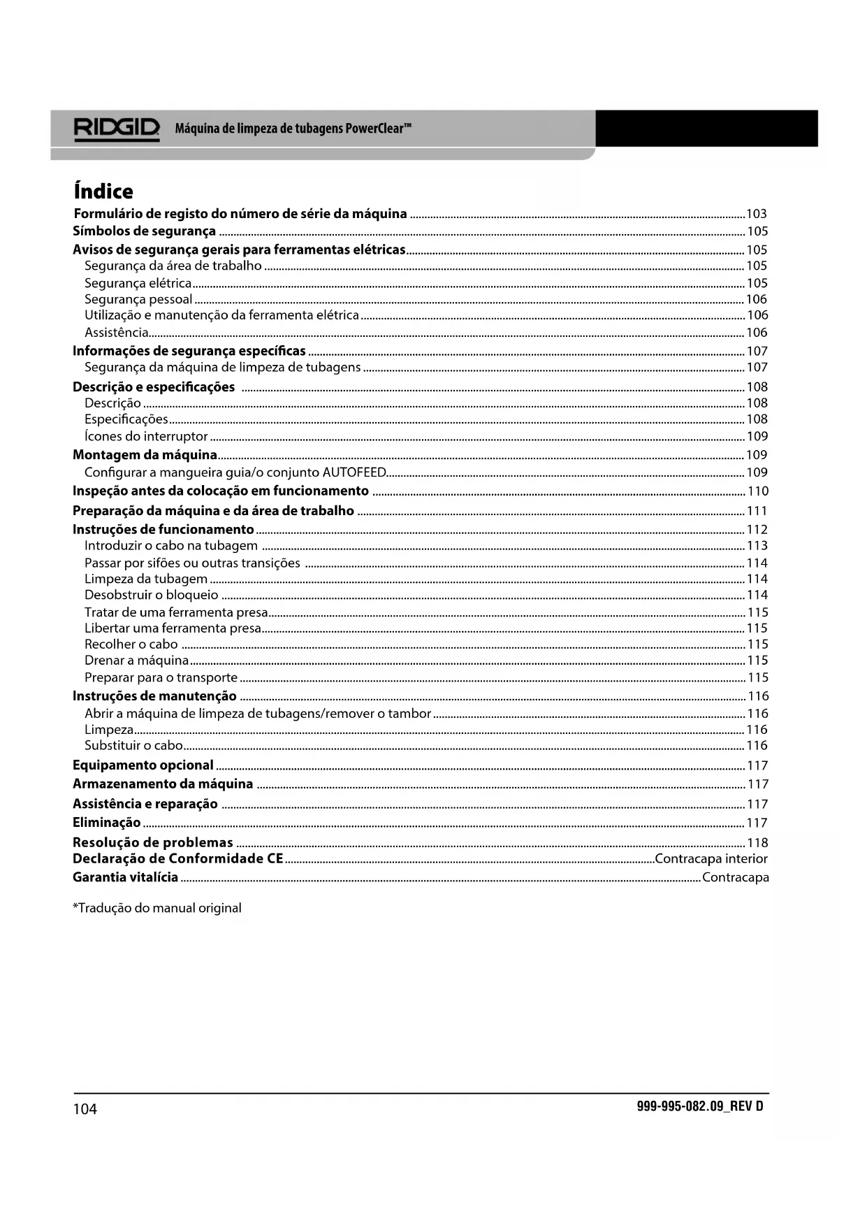 Macchina stasatrice PowerClear™Máquina de limpeza de tubagens PowerClear™ Registe o Número de Série abaixo e retenha o número de série do produto localizado na placa de nome. N.º de série AVISO! Leia o Manual do Operador cui- dadosamente antes de utilizar esta ferramenta. A não com- preensão e a inobservância do conteúdo deste manual pode resultar em choque elétrico, incêndio, e/ou ferimentos pes- soais graves. Máquina de limpeza de tubagens PowerClear™ Máquina de limpeza detubagens999-995-082.09_REV D Índice Formulário de registo do número de série da máquina 103 Declaração de Conformidade CE Contracapa interior Garantia vitalícia Contracapa *Tradução do manual original Símbolos de segurança