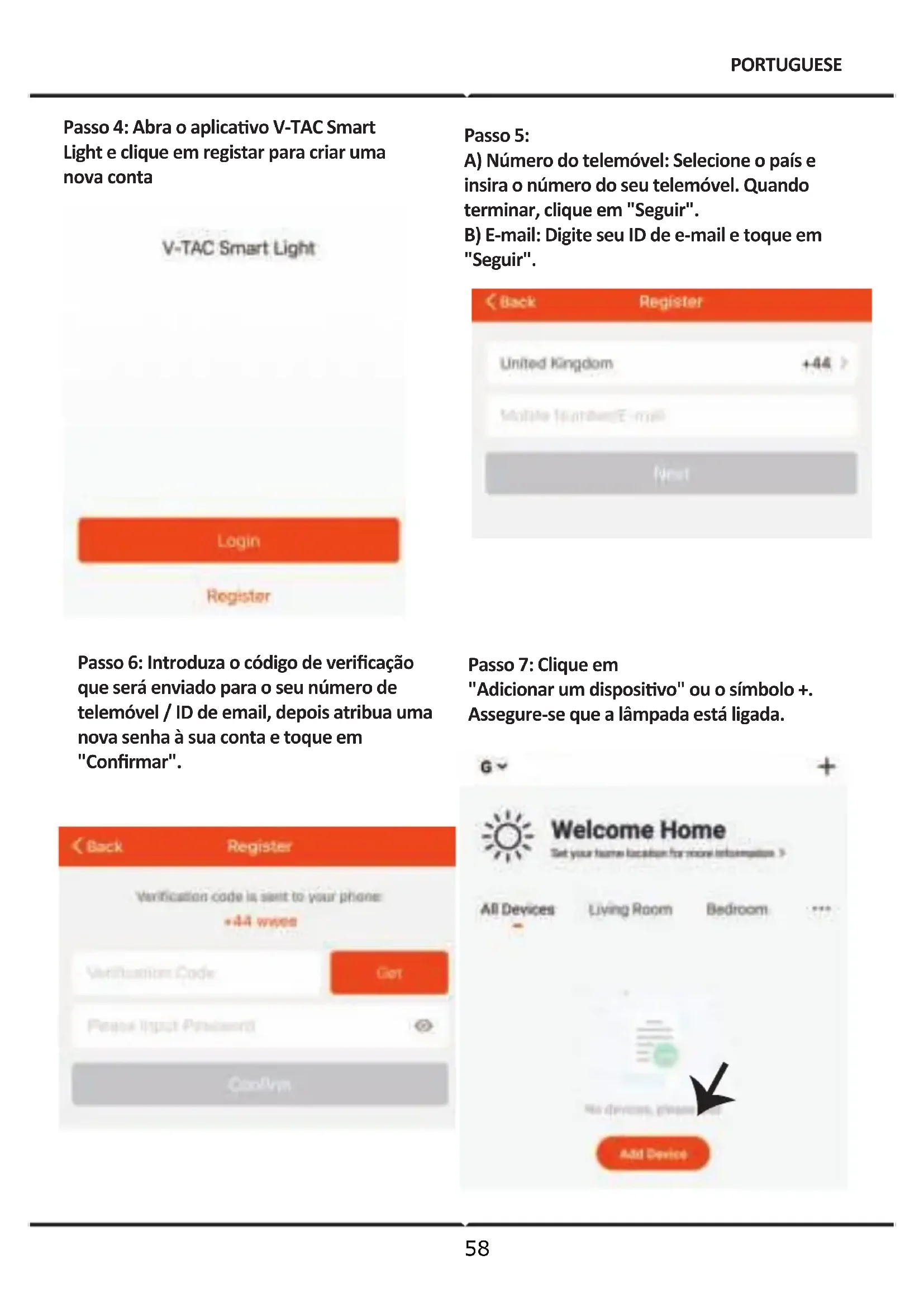 Passo 5: A) Número do telemóvel: Selecione o país e insira o número do seu telemóvel. Quando terminar, clique em "Seguir". B) E-mail: Digite seu ID de e-mail e toque em "Seguir". Passo 7: Clique em "Adicionar um disposivo" ou o símbolo +. Assegure-se que a lâmpada está ligada.PORTUGUESE