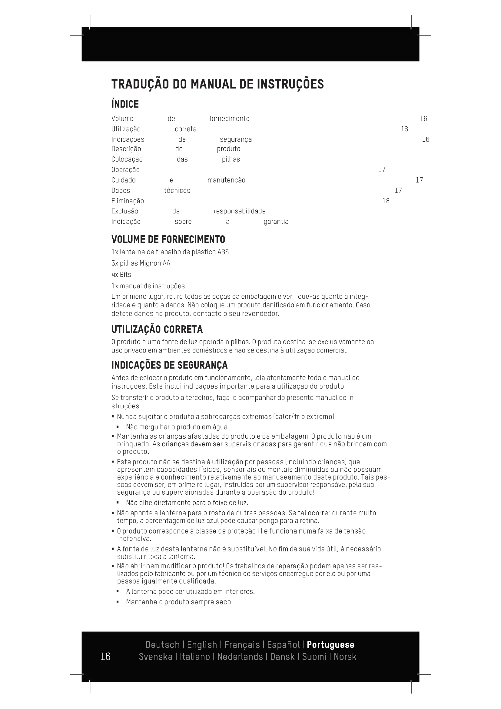 Antes de colocar o produto em funcionamento, leia atentamente todo o manual de instruções. Este inclui indicações importante para a utilização do produto. Se transferir o produto a terceiros, faça-o acompanhar do presente manual de in- struções. § Nunca sujeitar o produto a sobrecargas extremas (calor/frio extremo) § Não mergulhar o produto em água § Mantenha as crianças afastadas do produto e da embalagem. O produto não é um brinquedo. As crianças devem ser supervisionadas para garantir que não brincam com o produto. § Este produto não se destina à utilização por pessoas (incluindo crianças) que apresentem capacidades físicas, sensoriais ou mentais diminuídas ou não possuam experiência e conhecimento relativamente ao manuseamento deste produto. Tais pes- soas devem ser, em primeiro lugar, instruídas por um supervisor responsável pela sua segurança ou supervisionadas durante a operação do produto! § Não olhe diretamente para o feixe de luz. § Não aponte a lanterna para o rosto de outras pessoas. Se tal ocorrer durante muito tempo, a percentagem de luz azul pode causar perigo para a retina. § O produto corresponde à classe de proteção III e funciona numa faixa de tensão inofensiva. § A fonte de luz desta lanterna não é substituível. No fim da sua vida útil, é necessário substituir toda a lanterna. § Não abrir nem modificar o produto! Os trabalhos de reparação podem apenas ser rea- lizados pelo fabricante ou por um técnico de serviços encarregue por ele ou por uma pessoa igualmente qualificada. § A lanterna pode ser utilizada em interiores. § Mantenha o produto sempre seco. Volume de fornecimento 16 Utilização correta 16 Indicações de segurança 16 Descrição do produto 17 Colocação das pilhas 17 Operação 17 Cuidado e manutenção 17 Dados técnicos 17 Eliminação 18 Exclusão da responsabilidade 18 Indicação sobre a garantia 18 Deutsch | English | Français | Español | Portuguese Svenska | Italiano | Nederlands | Dansk | Suomi | Norsk Deutsch | English | Français | Español | Portuguese Svenska | Italiano | Nederlands | Dansk | Suomi | Norsk17 Deutsch | English | Français | Español | Portuguese Svenska | Italiano | Nederlands | Dansk | Suomi | Norsk ATENÇÃO § Este produto contém pilhas. Nunca atire o produto para o fogo. § As pilhas colocadas incorretamente podem vazar e/ou causar incêndio/explosão § Substituir sempre todas as pilhas em simultâneo e utilizar sempre baterias de qualida- de equivalente § Manter as pilhas fora do alcance das crianças > perigo de ingestão ou asfixia § Nunca tente abrir, esmagar, aquecer ou queimar uma pilha. § Não utilize as pilhas se o produto parecer danificado. § As pilhas não são recarregáveis! § Elimine as baterias usadas sempre de acordo com a legislação ou requisitos locais. § Não tocar nas pilhas em caso de derrame. Se entrar em contacto com líquido das pilhas, lave imediatamente os pontos afetados com água abundante. § Caso o líquido das pilhas cause uma reação na pele ou entrar nos olhos, entre imedia- tamente em contacto com um médico. § Não ligar as pilhas em curto-circuito! § Retire imediatamente da lanterna pilhas usadas ou vazias § Se não for possível continuar a utilizar a lanterna, deve retirar as pilhas da lanterna antes da eliminação. DESCRIÇÃO DO PRODUTO (VER PÁGINA 2) 1 Botão de ligar/desligar 2 LED COB 3 Bits 4 Ganchos de suporte 5 Íman de suporte 6 Compartimento das pilhas