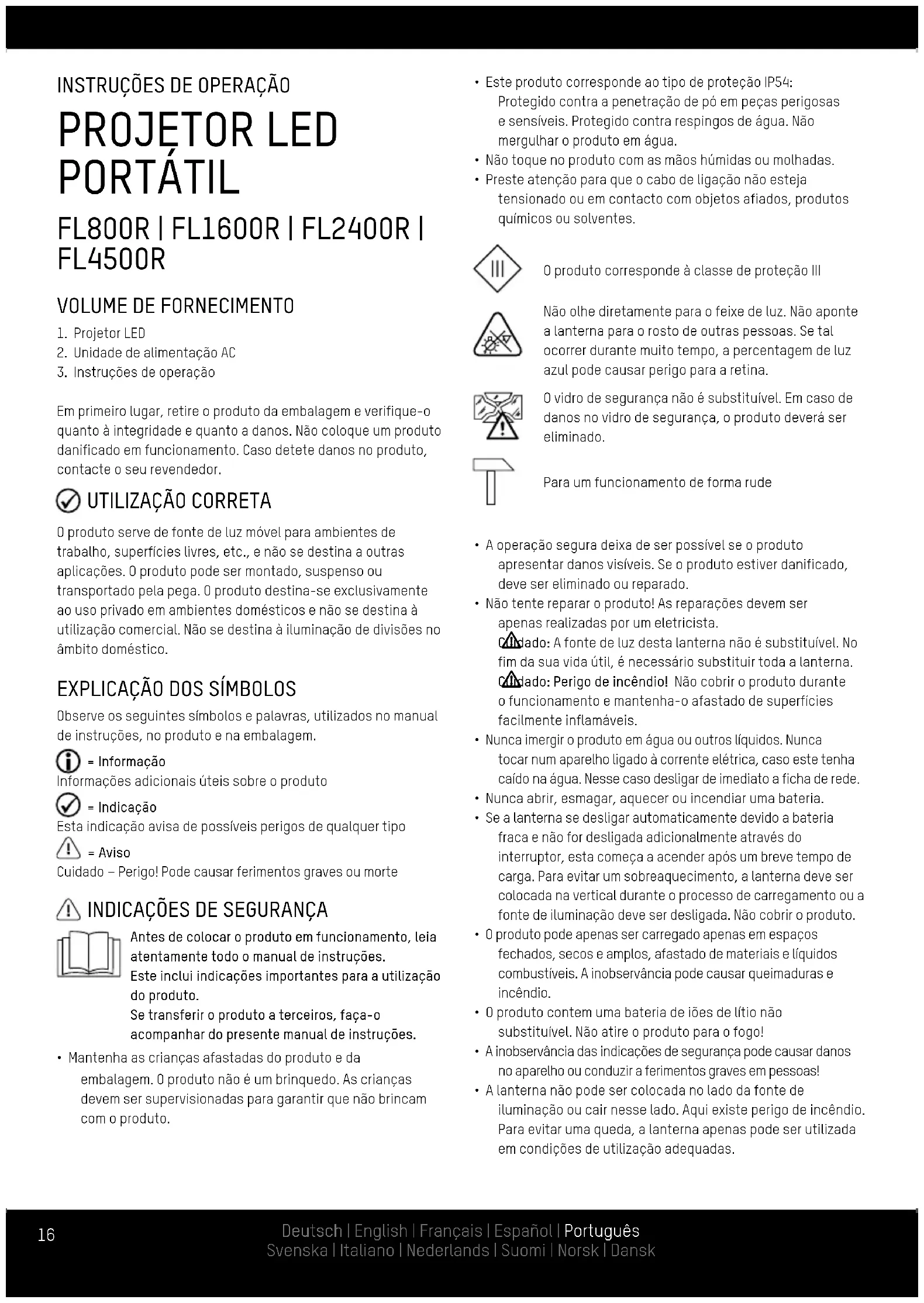 Modelo 1600-0274: FL800R 1600-0275: FL1600R 1600-0276: FL2400R 1600-0402: FL4500R Potência em Watt 10 W 20 W 30 W 50W Bateria de iões de lítio 7.4V 2200mAh 16.28Wh 7.4V 4400mAh 32.6Wh 11.1V 4400mAh 48.9Wh 11.1V 6600mA 73,26Wh Tensão de entrada 12V DC 12V DC 13.5V 13V DC Corrente de entrada 0,5A 1A 1A 1,8A Tipo de proteção IP IP54 (protegido contra respingos de água) Tipo de proteção IK IK05 Classe de proteção III Tipo de lâmpada SMD-LED Temperatura de cor 5000 K Indice de reprodução de cor (CRI) >80 Ra Intensidade luminosa 100%: 800 lm 50%: 400lm 25%: 200lm 100%: 1600 lm 50%: 800lm 25%: 400lm 100%: 2400lm 50%: 1200lm 25%: 600lm 100%: 4500 lm 50%: 2500 lm 25%: 1200 lm Duração de iluminação 100%: 3h 50%: 6h 25%: 12h 100%: 3h 50%: 6h 25%: 10h 100%: 3h 50%: 6h 25%: 10h 100%: 3h 50%: 6h 25%: 12h Tempo de carga 4h 4-5h 5-6h 5-6h Superfície de projeção máxima 474 cm
