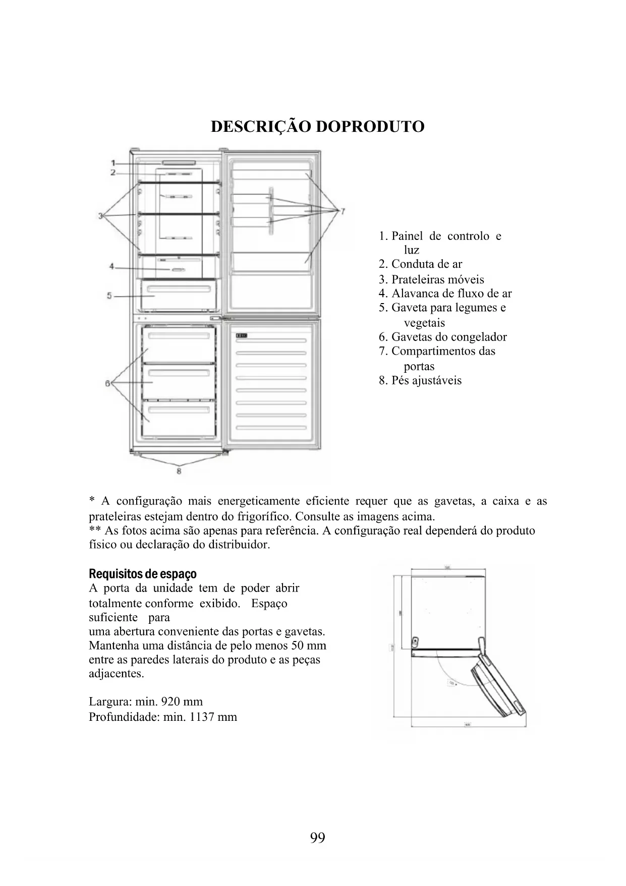 A configuração mais energeticamente eficiente require que as gavetas, a caixa e as prateleiras esteyam dentro do frigorífico. Consulte as imagens acima.