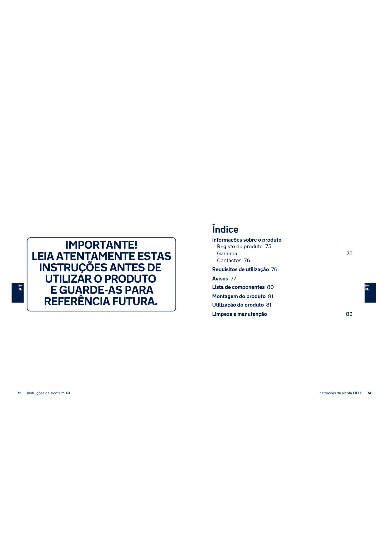 REFERÊNCIA FUTURA. Índice Informações sobre o produto Registo do produto 75 Garantia 75 Contactos 76 Requisitos de utilização 76 Avisos 77 Lista de componentes 80 Montagem do produto 81 Utilização do produto 81 Limpeza e manutenção 8375 Instruções da alcofa MIXX 76Instruções da alcofa MIXX