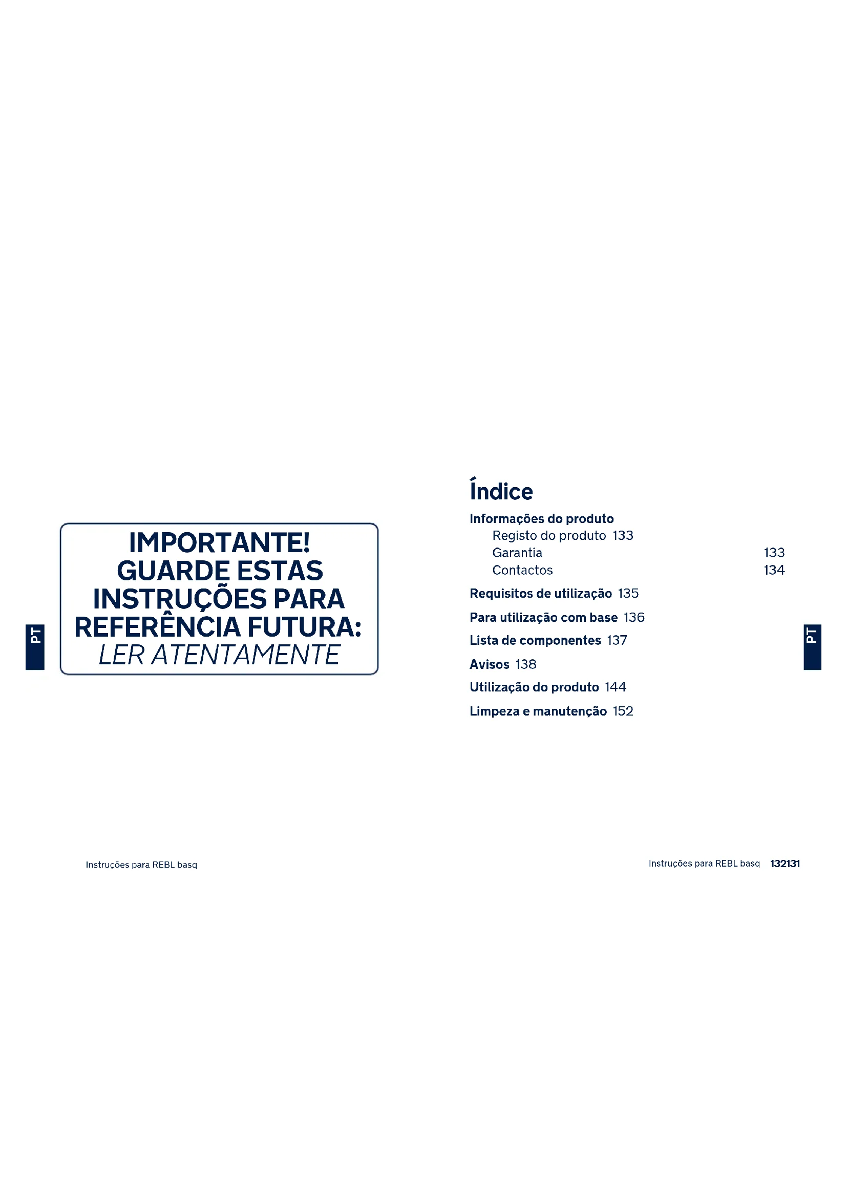 Índice Informações do produto Registo do produto 133 Garantia 133 Contactos 134 Requisitos de utilização 135 Para utilização com base 136 Lista de componentes 137 Avisos 138 Utilização do produto 144 Limpeza e manutenção 152 IMPORTANTE! GUARDE ESTAS