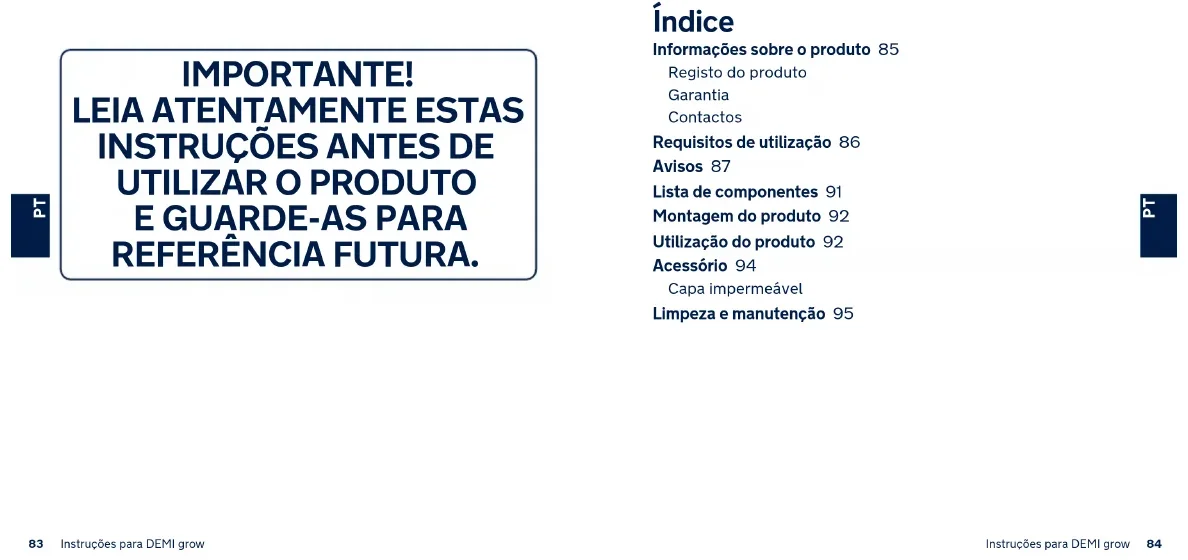 REFERÊNCIA FUTURA. Índice Informações sobre o produto 85 Registo do produto Garantia Contactos Requisitos de utilização 86 Avisos 87 Lista de componentes 91 Montagem do produto 92 Utilização do produto 92 Acessório 94 Capa impermeável Limpeza e manutenção 9585 Instruções para DEMI grow 86Instruções para DEMI grow
