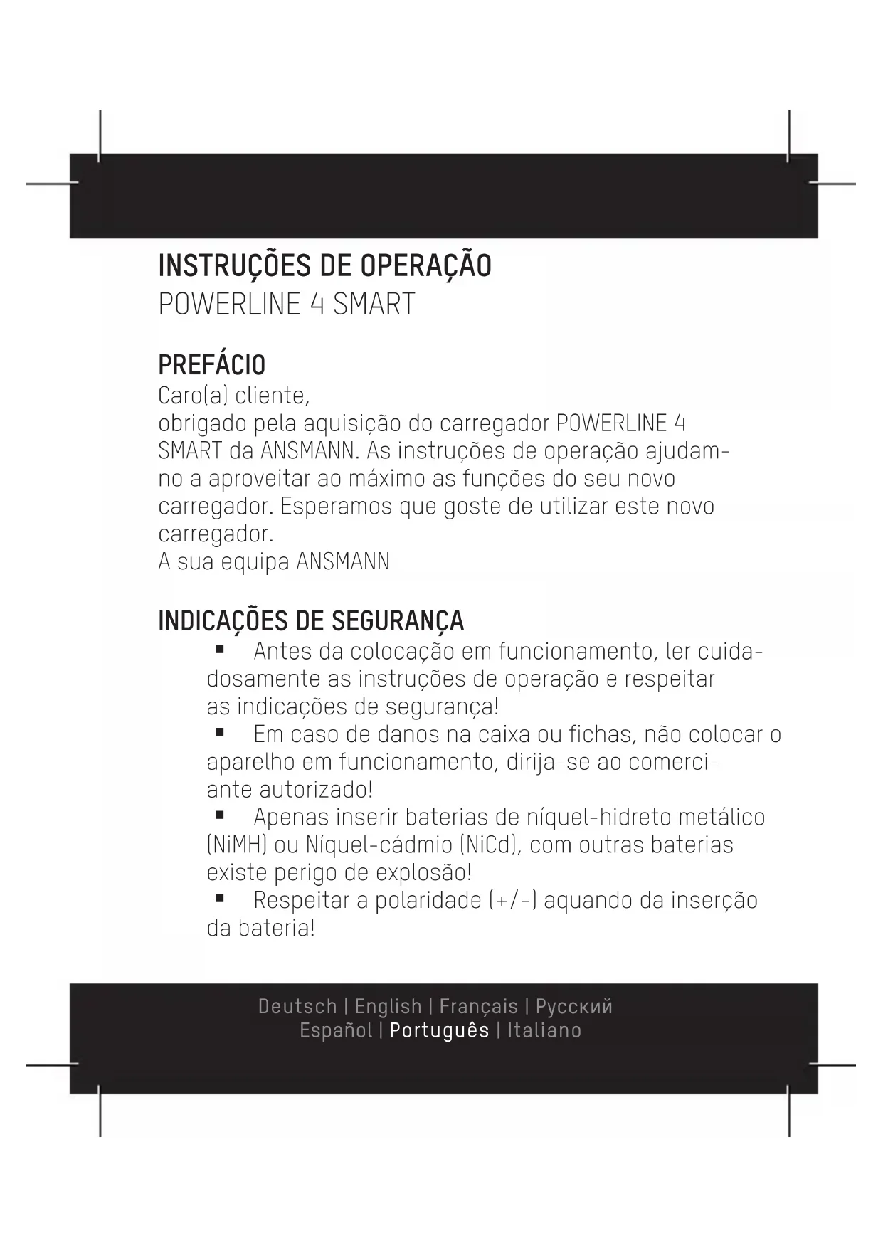 Antes da colocação em funcionamento, ler cuida- dosamente as instruções de operação e respeitar as indicações de segurança! Em caso de danos na caixa ou fichas, não colocar o aparelho em funcionamento, dirija-se ao comerci- ante autorizado! Apenas inserir baterias de níquel-hidreto metálico (NiMH) ou Níquel-cádmio (NiCd), com outras baterias existe perigo de explosão! Respeitar a polaridade (+/-) aquando da inserção da bateria! Deutsch | English | Français | Pусский Español | Português | Italiano Apenas podem ser carregadas baterias no aparelho que foram concebidos para a corrente de carga do carregador! O aparelho pode apenas ser utilizado em espaços fechados e secos! Para excluir perigo de incêndio ou de choque elétri- co, proteger o aparelho da humidade e da chuva! Realizar trabalhos de limpeza e de manutenção apenas com a ficha de alimentação desligada! Não abrir o aparelho! Manter fora do alcance das crianças! As crianças devem ser supervisionadas para garantir que não brincam com o aparelho! Este aparelho não se destina à utilização por pessoas (incluindo crianças) que apresentem cap- acidades físicas, sensoriais ou mentais diminuídas ou não possuam experiência e conhecimento rela- tivamente ao manuseamento deste aparelho. Tais pessoas devem ser, em primeiro lugar, instruídas por um supervisor responsável pela sua segurança e supervisionadas durante a operação do aparelho! A inobservância das indicações de segurança pode causar danos no aparelho, na bateria ou ferimen- tos graves! Recomendamos a utilização da bateria da ANSMANN! Deutsch | English | Français | Pусский Español | Português | ItalianoVISTA GERAL DAS FUNCIONALIDADES Carregador inteligente para 1-4 baterias Mignon (AA) / Micro (AAA) NiMH Autodiagnóstico das baterias inseridas, se ne- cessário um início automático de um modo de reparação para a reativação de uma bateria com descarga total e pré-carga suave com corrente reduzida Início de carregamento automático após contato de uma bateria Controlo de carga supervisionado por microinter- ruptor Proteção múltipla de sobrecarga através de super- visão de tensão (-dU) e temporizador de segurança Deteção de bateria completa e mudança automáti- ca em impulsos de manutenção Supervisão de ranhura individual (carregamento separado para cada bateria) Proteção contra inversão de polaridade Deteção de bateria com defeito Indicação do estado de bateria através LED multi- color por ranhura de carga Possibilidade de utilização em todo o mundo (100V- 240V AC / 50-60Hz) Deutsch | English | Français | Pусский Español | Português | ItalianoCOLOCAÇÃO EM FUNCIONAMENTO Coloque as fichas de alimentação (consoante o modelo/a versão do país, podem estar incluídas diferentes fichas de alimentação por ex. Euro, UK, US ou AU no volume de fornecimento) sobre os dois contatos de rede e desloque a ficha até ao batente na guia (ver figura). Tenha atenção para que a ficha engate audivelmente aquando da sus- pensão. O carregador está agora operacional. Para soltar/substituir a ficha de alimentação, pressione cuidadosamente o pino de bloqueio (por ex. com um perno) um pouco para baixo e deslocar a ficha para trás. Coloque o carregador numa tomada adequada. A disponi- bilidade operacional é exibida através de todos os 4 LEDs que piscam três vezes a cor de laranja. Pode inserir até 4 baterias NiMH ou NiCd dos tamanhos Mignon AA ou Micro AAA (também misturado). Certifique-se de ligar a bateria com a polaridade correta, de acordo com os símbolos na ranhura de carga. O processo de carregamento inicia automaticamente.O estado de carga de cada bateria é exibido através das luzes de controlo (ver INDICADOR DO ESTADO DE CARGA) acima da ranhura de carga.As baterias não podem ser inseridas simultaneamente, uma vez que os processos de carregamento da bateria são controla- dos de modo independente entre si. Um aquecimento da bateria durante o processo de carregamento é normal. Deutsch | English | Français | Pусский Español | Português | ItalianoApós um carregamento de sucesso de uma bateria ocorre a mudança automática na carga por impulsos de manutenção. Esta função garante um desempenho ideal e impede a descarga automática da bateria.
