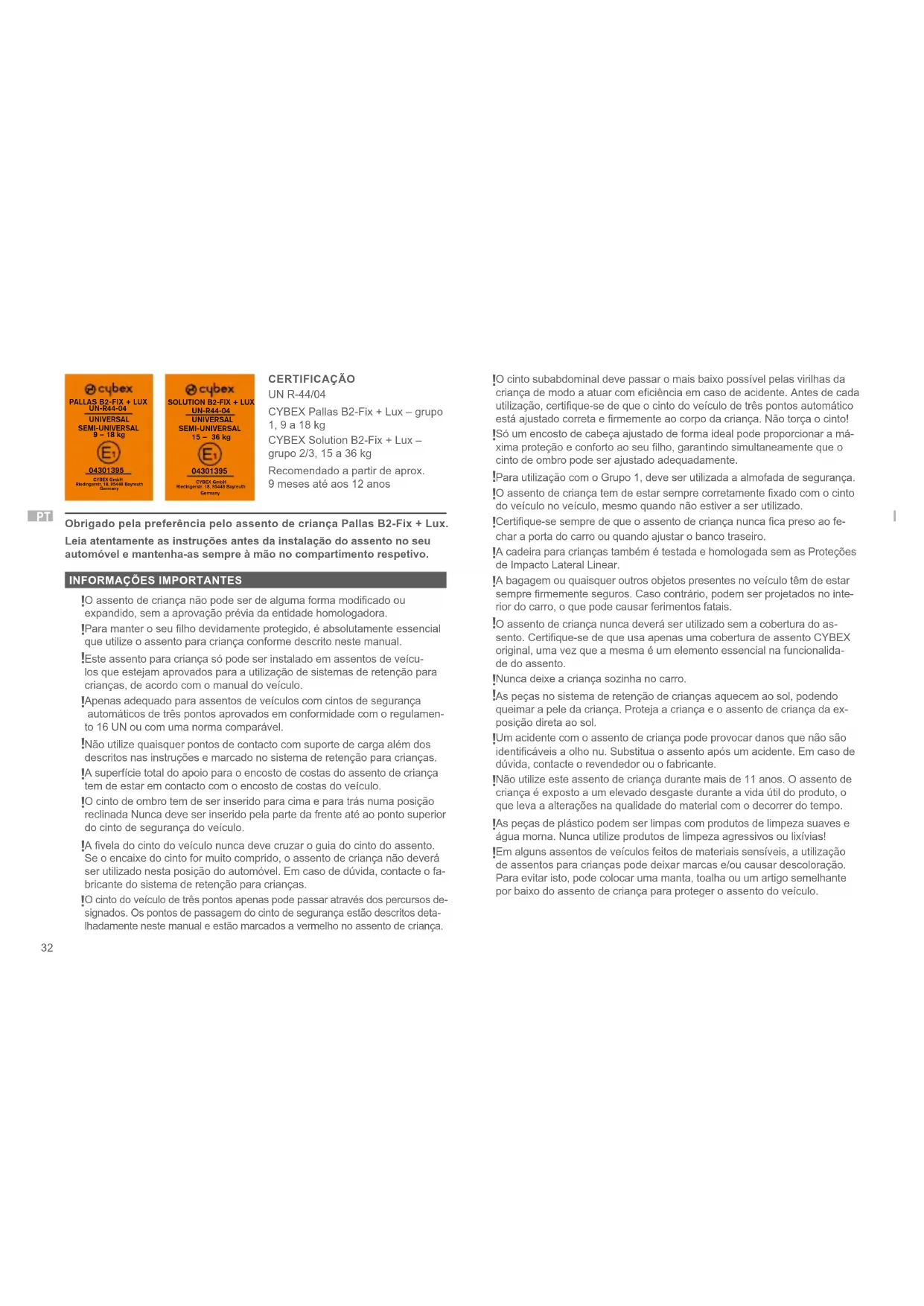 CERTIFICAÇÃO UN R-44/04 CYBEX Pallas B2-Fix + Lux – grupo 1, 9 a 18 kg CYBEX Solution B2-Fix + Lux – grupo 2/3, 15 a 36 kg Recomendado a partir de aprox. 9 meses até aos 12 anos Obrigado pela preferência pelo assento de criança Pallas B2-Fix + Lux. Leia atentamente as instruções antes da instalação do assento no seu automóvel e mantenha-as sempre à mão no compartimento respetivo.