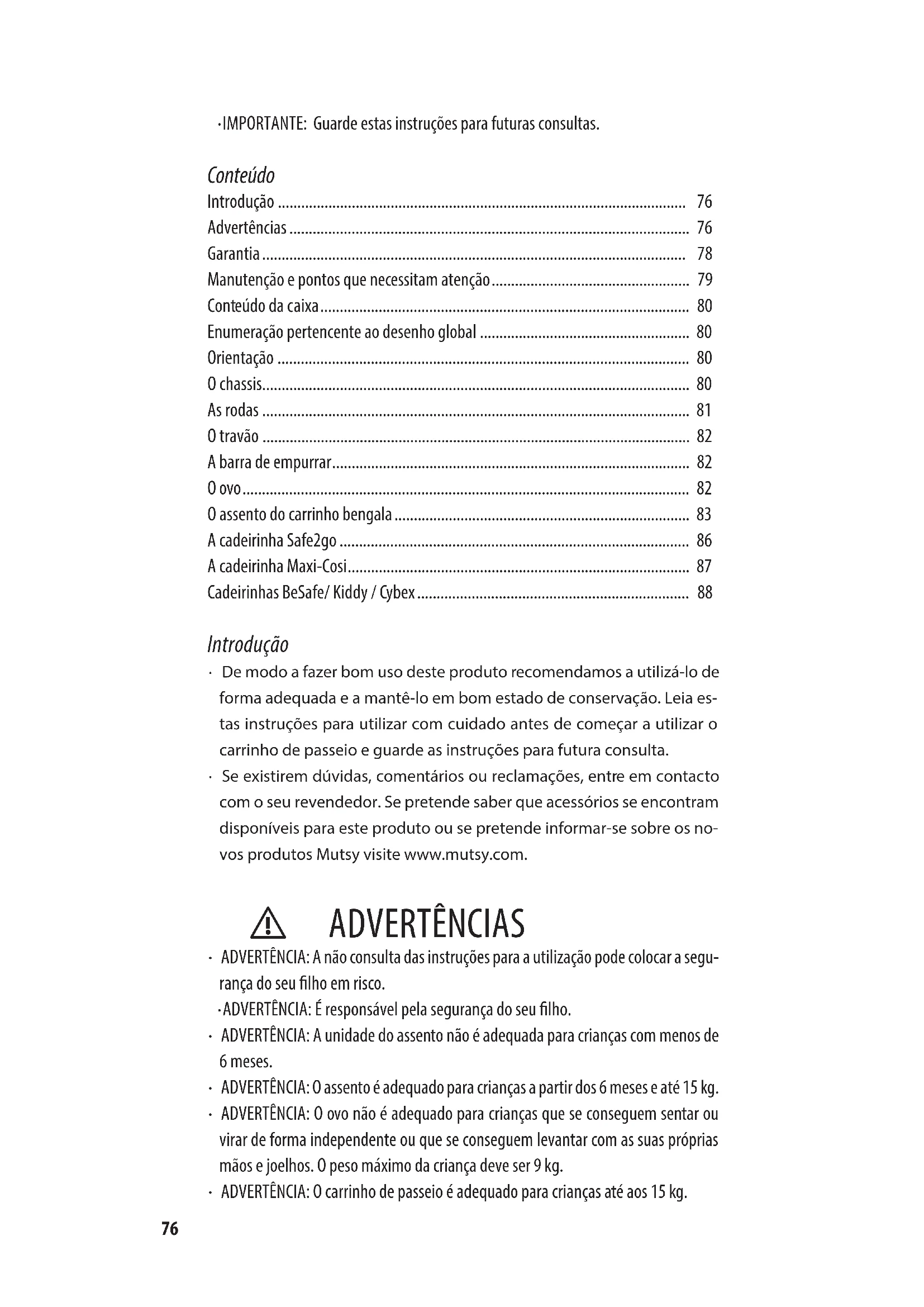 - Se existirem dúvidas, comentários ou reclamações, entre em contacto com o seu revendedor. Se pretende saber que acessórios se encontram disponíveis para este produto ou se pretende informar-se sobre os no- vos produtos Mutsy visite www.mutsy.com. ⚠ ADVERTÊNCIAS