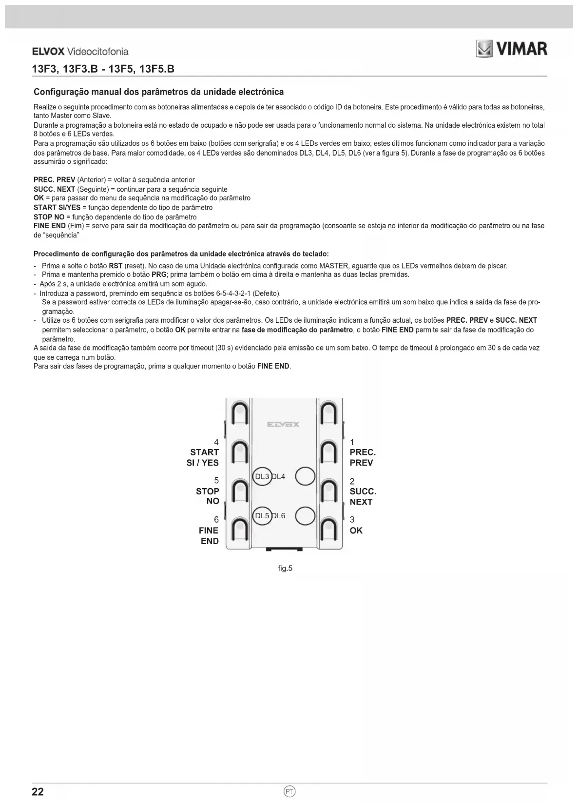 13F3, 13F3.B - 13F5, 13F5.BConfiguração manual dos parâmetros da unidade electrónica Realize o seguinte procedimento com as botoneiras alimentadas e depois de ter associado o código ID da botoneira. Este procedimento é válido para todas as botoneiras, tanto Master como Slave. Durante a programação a botoneira está no estado de ocupado e não pode ser usada para o funcionamento normal do sistema. Na unidade electrónica existem no total 8 botões e 6 LEDs verdes. Para a programação são utilizados os 6 botões em baixo (botões com serigrafia) e os 4 LEDs verdes em baixo; estes últimos funcionam como indicador para a variação dos parâmetros de base. Para maior comodidade, os 4 LEDs verdes são denominados DL3, DL4, DL5, DL6 (ver a figura 5). Durante a fase de programação os 6 botões assumirão o significado: PREC. PREV (Anterior) = voltar à sequência anterior SUCC. NEXT (Seguinte) = continuar para a sequência seguinte OK = para passar do menu de sequência na modificação do parâmetro START SI/YES = função dependente do tipo de parâmetro STOP NO = função dependente do tipo de parâmetro FINE END (Fim) = serve para sair da modificação do parâmetro ou para sair da programação (consoante se esteja no interior da modificação do parâmetro ou na fase de “sequência” Procedimento de configuração dos parâmetros da unidade electrónica através do teclado: - Prima e solte o botão RST (reset). No caso de uma Unidade electrónica configurada como MASTER, aguarde que os LEDs vermelhos deixem de piscar. - Prima e mantenha premido o botão PRG; prima também o botão em cima à direita e mantenha as duas teclas premidas. - Após 2 s, a unidade electrónica emitirá um som agudo. - Introduza a password, premindo em sequência os botões 6-5-4-3-2-1 (Defeito). Se a password estiver correcta os LEDs de iluminação apagar-se-ão, caso contrário, a unidade electrónica emitirá um som baixo que indica a saída da fase de pro