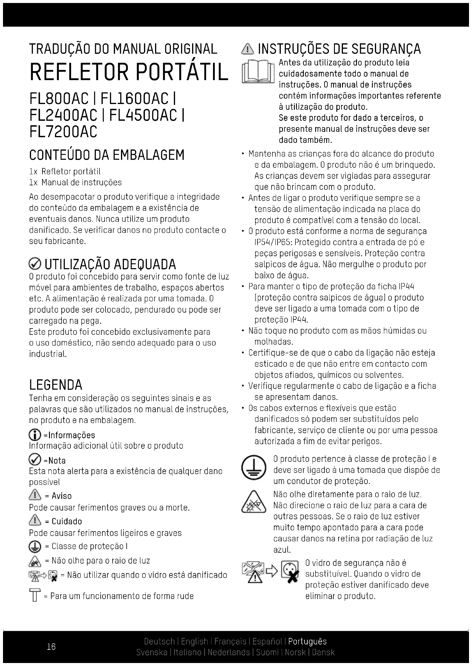 Modelo 1600-0277: FL800AC 1600-0278: FL1600AC 1600-0279: FL2400AC 1600-0403: FL4500AC 1600-0404: FL7200AC Tensão de ligação 230 V~, 50/60 Hz 220-240 V~, 50/60 Hz Potência em Watt 10 W 20 W 30 W 50W 80W Grau de proteção IP IP54 (proteção contra salpicos de água) IP65 Tipo de proteção IK IK05 Tipo de proteção IP (ficha) IP44 (proteção contra salpicos de água) Classe de proteção I Tipo de luz LED Cor da temperatura 5000 K Índice da reprodução de cor (CRI) >80 Ra Tensão nominal da luz 900 lm 1800 lm 2700 lm 4500lm 7200lm Superfície máxima de projeção 454 cm