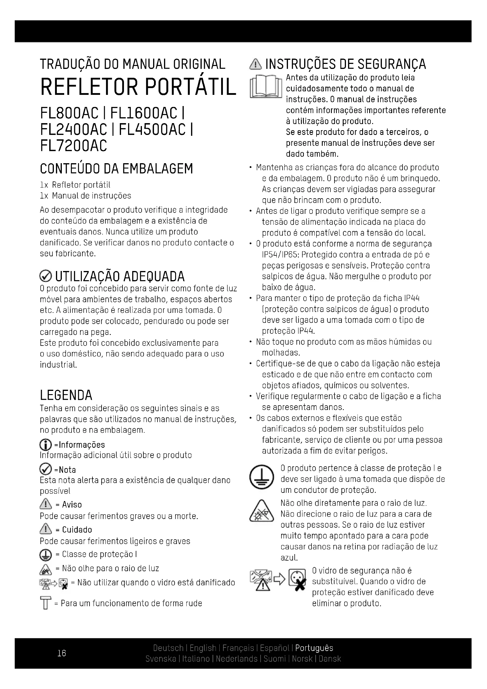 - Os cabos externos e flexíveis que estão danificados só podem ser substituídos pelo fabricante, serviço de cliente ou por uma pessoa autorizada a fim de evitar perigos. O produto pertence à classe de proteção I e deve ser ligado à uma tomada que dispõe de um condutor de proteção. Não olhe diretamente para o raio de luz. Não direcione o raio de luz para a cara de outras pessoas. Se o raio de luz estiver muito tempo apontado para a cara pode causar danos na retina por radiação de luz azul. O vidro de segurança não é substituível. Quando o vidro de proteção estiver danificado deve eliminar o produto.Deutsch | English | Français | Español | Português Svenska | Italiano | Nederlands | Suomi | Norsk | Dansk Deutsch | English | Français | Español | Português Svenska | Italiano | Nederlands | Suomi | Norsk | Dansk