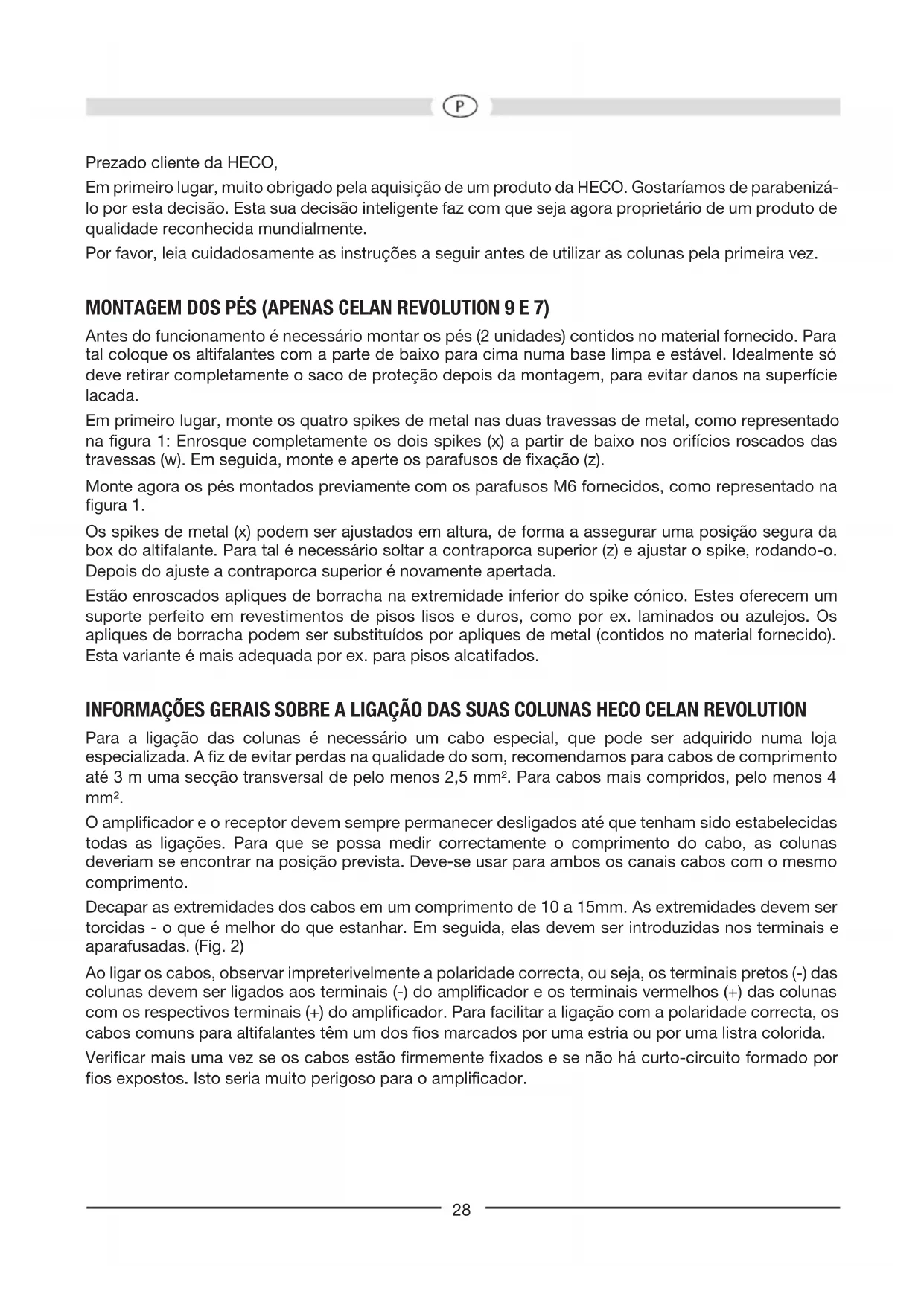 Conguración: Reejo bajo de 2 vías Reejo bajo de 2 vías Resistencia: 100 / 160 vatios 120 / 180 vatios Impedancia: 4 – 8 ohmios 4 – 8 ohmios Gama de frecuencias: 30 – 52 000 Hz 30 – 52 000 Hz Potencia recomendada del amplicador: 30 – 160 vatios 30 – 180 vatios Rendimiento (1 vatio/1 m): 90 dB 90 dB Dimensiones (an x al x pr): 240 x 420 x 360 mm 598 x 212 x 360 mm Accesorios: Puntas de caucho endurecido Puntas de caucho endurecido RESERVADOS LOS DERECHOS DE REALIZAR CAMBIOS TÉCNICOS.28 Prezado cliente da HECO, Em primeiro lugar, muito obrigado pela aquisição de um produto da HECO. Gostaríamos de parabenizá- lo por esta decisão. Esta sua decisão inteligente faz com que seja agora proprietário de um produto de qualidade reconhecida mundialmente. Por favor, leia cuidadosamente as instruções a seguir antes de utilizar as colunas pela primeira vez. MONTAGEM DOS PÉS (APENAS CELANREVOLUTION 9 E 7) Antes do funcionamento é necessário montar os pés (2 unidades) contidos no material fornecido. Para tal coloque os altifalantes com a parte de baixo para cima numa base limpa e estável. Idealmente só deve retirar completamente o saco de proteção depois da montagem, para evitar danos na superfície lacada. Em primeiro lugar, monte os quatro spikes de metal nas duas travessas de metal, como representado na gura 1: Enrosque completamente os dois spikes (x) a partir de baixo nos orifícios roscados das travessas (w). Em seguida, monte e aperte os parafusos de xação (z). Monte agora os pés montados previamente com os parafusos M6 fornecidos, como representado na gura 1. Os spikes de metal (x) podem ser ajustados em altura, de forma a assegurar uma posição segura da box do altifalante. Para tal é necessário soltar a contraporca superior (z) e ajustar o spike, rodando-o. Depois do ajuste a contraporca superior é novamente apertada. Estão enroscados apliques de borracha na extremidade inferior do spike cónico. Estes oferecem um suporte perfeito em revestimentos de pisos lisos e duros, como por ex. laminados ou azulejos. Os apliques de borracha podem ser substituídos por apliques de metal (contidos no material fornecido). Esta variante é mais adequada por ex. para pisos alcatifados. INFORMAÇÕES GERAIS SOBRE A LIGAÇÃO DAS SUAS COLUNAS HECO CELANREVOLUTION Para a ligação das colunas é necessário um cabo especial, que pode ser adquirido numa loja especializada. A z de evitar perdas na qualidade do som, recomendamos para cabos de comprimento até 3 m uma secção transversal de pelo menos 2,5 mm². Para cabos mais compridos, pelo menos 4 mm². O amplicador e o receptor devem sempre permanecer desligados até que tenham sido estabelecidas todas as ligações. Para que se possa medir correctamente o comprimento do cabo, as colunas deveriam se encontrar na posição prevista. Deve-se usar para ambos os canais cabos com o mesmo comprimento. Decapar as extremidades dos cabos em um comprimento de 10 a 15mm. As extremidades devem ser torcidas - o que é melhor do que estanhar. Em seguida, elas devem ser introduzidas nos terminais e aparafusadas. (Fig. 2) Ao ligar os cabos, observar impreterivelmente a polaridade correcta, ou seja, os terminais pretos (-) das colunas devem ser ligados aos terminais (-) do amplicador e os terminais vermelhos (+) das colunas com os respectivos terminais (+) do amplicador. Para facilitar a ligação com a polaridade correcta, os cabos comuns para altifalantes têm um dos os marcados por uma estria ou por uma listra colorida. Vericar mais uma vez se os cabos estão rmemente xados e se não há curto-circuito formado por os expostos. Isto seria muito perigoso para o amplicador.29 COLUNAS HECO CELANREVOLUTION NO MODO ESTÉREO Se adquire a posição ideal para escutar quando as colunas e o local onde se encontra a pessoa que escuta formam um triângulo isósceles. Através da equidistância entre as colunas esquerda e direita e o local no qual se encontra o ouvinte, os sinais acústicos são reproduzidos em tempo real e é obtido um som natural e equilibrado. (Fig. 3) Convém que haja contacto visual entre a pessoa que escuta a música e as colunas. Obstáculos amortecedores ou reectores de som deturpam a qualidade. Para instalar colunas, é necessário respeitar as seguintes distâncias mínimas: Colunas independentes: Pelo menos 20 cm da parede traseira e pelo menos 30 cm da parede lateral. Desta maneira evita-se a reprodução exagerada de graves. Colunas para estantes: Mesmo colunas instaladas em estantes deveriam ser montadas livremente, mantendo nos lados e na retaguarda uma distância mínima de 10 cm das paredes e objectos. Altifalantes de agudos devem se encontrar à altura dos ouvidos. As colunas HECO CELANREVOLUTION podem ser combinadas de forma ideal com o subwoofer activo CELAN REVOLUTION SUB 32A. As gura 4 ilustra uma forma de ligação. Favor observar também as instruções de utilização do subwoofer e do amplicador. COLUNAS HECO CELANREVOLUTION COMO ALTIFALANTE FRONTAL E DE RETAGUARDA Os altifalantes frontais devem ser posicionados à esquerda e à direita do televisor, mantendo, dentro do possível, a mesma distância, na altura dos ouvidos. Os altifalantes de retaguarda devem ser colocados junto ou melhor ainda atrás da posição do ouvinte, de preferência na altura dos ouvidos ou um pouco acima. (Fig.5) O CABO DE LIGAÇÃO DOS ALTIFALANTES HECO CELANREVOLUTION / BI-WIRING E BI-AMPING Os campos de ligação dos altifalantes CELANREVOLUTION possui cinco terminais com xação por parafuso, que, além da ligação convencional a um amplicador, permitem também a opção Bi-wiring/ Bi-amping. Os terminais superiores estão ligados ao ramal de agudos ou de médios e agudos da derivação de frequência. Os terminais inferiores estão ligados ao ramal de graves. Através de um terminal adicional, pode ser seleccionado um aumento dos agudos em 2dB. Bi-wiring signica a transmissão de frequências altas e baixas por os separados. 