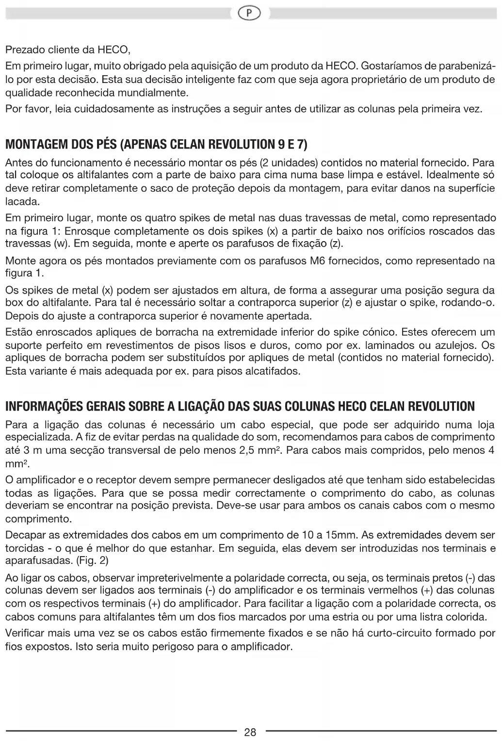Conguración: Reejo bajo de 2 vías Reejo bajo de 2 vías Resistencia: 100 / 160 vatios 120 / 180 vatios Impedancia: 4 – 8 ohmios 4 – 8 ohmios Gama de frecuencias: 30 – 52 000 Hz 30 – 52 000 Hz Potencia recomendada del amplicador: 30 – 160 vatios 30 – 180 vatios Rendimiento (1 vatio/1 m): 90 dB 90 dB Dimensiones (an x al x pr): 240 x 420 x 360 mm 598 x 212 x 360 mm Accesorios: Puntas de caucho endurecido Puntas de caucho endurecido RESERVADOS LOS DERECHOS DE REALIZAR CAMBIOS TÉCNICOS.28 Prezado cliente da HECO, Em primeiro lugar, muito obrigado pela aquisição de um produto da HECO. Gostaríamos de parabenizá- lo por esta decisão. Esta sua decisão inteligente faz com que seja agora proprietário de um produto de qualidade reconhecida mundialmente. Por favor, leia cuidadosamente as instruções a seguir antes de utilizar as colunas pela primeira vez. MONTAGEM DOS PÉS (APENAS CELANREVOLUTION 9 E 7) Antes do funcionamento é necessário montar os pés (2 unidades) contidos no material fornecido. Para tal coloque os altifalantes com a parte de baixo para cima numa base limpa e estável. Idealmente só deve retirar completamente o saco de proteção depois da montagem, para evitar danos na superfície lacada. Em primeiro lugar, monte os quatro spikes de metal nas duas travessas de metal, como representado na gura 1: Enrosque completamente os dois spikes (x) a partir de baixo nos orifícios roscados das travessas (w). Em seguida, monte e aperte os parafusos de xação (z). Monte agora os pés montados previamente com os parafusos M6 fornecidos, como representado na gura 1. Os spikes de metal (x) podem ser ajustados em altura, de forma a assegurar uma posição segura da box do altifalante. Para tal é necessário soltar a contraporca superior (z) e ajustar o spike, rodando-o. Depois do ajuste a contraporca superior é novamente apertada. Estão enroscados apliques de borracha na extremidade inferior do spike cónico. Estes oferecem um suporte perfeito em revestimentos de pisos lisos e duros, como por ex. laminados ou azulejos. Os apliques de borracha podem ser substituídos por apliques de metal (contidos no material fornecido). Esta variante é mais adequada por ex. para pisos alcatifados. INFORMAÇÕES GERAIS SOBRE A LIGAÇÃO DAS SUAS COLUNAS HECO CELANREVOLUTION Para a ligação das colunas é necessário um cabo especial, que pode ser adquirido numa loja especializada. A z de evitar perdas na qualidade do som, recomendamos para cabos de comprimento até 3 m uma secção transversal de pelo menos 2,5 mm². Para cabos mais compridos, pelo menos 4 mm². O amplicador e o receptor devem sempre permanecer desligados até que tenham sido estabelecidas todas as ligações. Para que se possa medir correctamente o comprimento do cabo, as colunas deveriam se encontrar na posição prevista. Deve-se usar para ambos os canais cabos com o mesmo comprimento. Decapar as extremidades dos cabos em um comprimento de 10 a 15mm. As extremidades devem ser torcidas - o que é melhor do que estanhar. Em seguida, elas devem ser introduzidas nos terminais e aparafusadas. (Fig. 2) Ao ligar os cabos, observar impreterivelmente a polaridade correcta, ou seja, os terminais pretos (-) das colunas devem ser ligados aos terminais (-) do amplicador e os terminais vermelhos (+) das colunas com os respectivos terminais (+) do amplicador. Para facilitar a ligação com a polaridade correcta, os cabos comuns para altifalantes têm um dos os marcados por uma estria ou por uma listra colorida. Vericar mais uma vez se os cabos estão rmemente xados e se não há curto-circuito formado por os expostos. Isto seria muito perigoso para o amplicador.29 COLUNAS HECO CELANREVOLUTION NO MODO ESTÉREO Se adquire a posição ideal para escutar quando as colunas e o local onde se encontra a pessoa que escuta formam um triângulo isósceles. Através da equidistância entre as colunas esquerda e direita e o local no qual se encontra o ouvinte, os sinais acústicos são reproduzidos em tempo real e é obtido um som natural e equilibrado. (Fig. 3) Convém que haja contacto visual entre a pessoa que escuta a música e as colunas. Obstáculos amortecedores ou reectores de som deturpam a qualidade. Para instalar colunas, é necessário respeitar as seguintes distâncias mínimas: Colunas independentes: Pelo menos 20 cm da parede traseira e pelo menos 30 cm da parede lateral. Desta maneira evita-se a reprodução exagerada de graves. Colunas para estantes: Mesmo colunas instaladas em estantes deveriam ser montadas livremente, mantendo nos lados e na retaguarda uma distância mínima de 10 cm das paredes e objectos. Altifalantes de agudos devem se encontrar à altura dos ouvidos. As colunas HECO CELANREVOLUTION podem ser combinadas de forma ideal com o subwoofer activo CELAN REVOLUTION SUB 32A. As gura 4 ilustra uma forma de ligação. Favor observar também as instruções de utilização do subwoofer e do amplicador. COLUNAS HECO CELANREVOLUTION COMO ALTIFALANTE FRONTAL E DE RETAGUARDA Os altifalantes frontais devem ser posicionados à esquerda e à direita do televisor, mantendo, dentro do possível, a mesma distância, na altura dos ouvidos. Os altifalantes de retaguarda devem ser colocados junto ou melhor ainda atrás da posição do ouvinte, de preferência na altura dos ouvidos ou um pouco acima. (Fig.5) O CABO DE LIGAÇÃO DOS ALTIFALANTES HECO CELANREVOLUTION / BI-WIRING E BI-AMPING Os campos de ligação dos altifalantes CELANREVOLUTION possui cinco terminais com xação por parafuso, que, além da ligação convencional a um amplicador, permitem também a opção Bi-wiring/ Bi-amping. Os terminais superiores estão ligados ao ramal de agudos ou de médios e agudos da derivação de frequência. Os terminais inferiores estão ligados ao ramal de graves. Através de um terminal adicional, pode ser seleccionado um aumento dos agudos em 2dB. Bi-wiring signica a transmissão de frequências altas e baixas por os separados. 