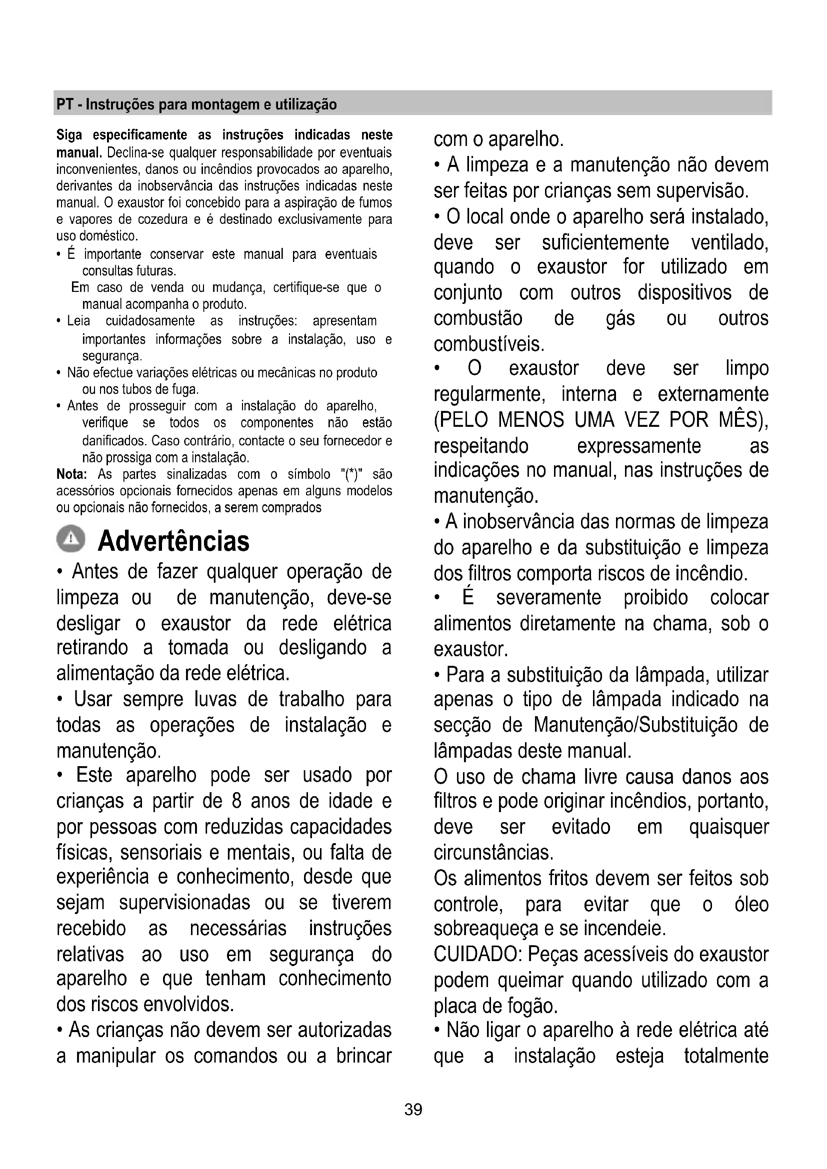 Volver a montar la rejilla. Si la iluminación no funciona, antes de llamar al servicio de asistencia técnica, revisar que las lámparas estén correctamente instaladas.39 PT - Instruções para montagem e utilização Siga especificamente as instruções indicadas neste manual. Declina-se qualquer responsabilidade por eventuais inconvenientes, danos ou incêndios provocados ao aparelho, derivantes da inobservância das instruções indicadas neste manual. O exaustor foi concebido para a aspiração de fumos e vapores de cozedura e é destinado exclusivamente para uso doméstico.