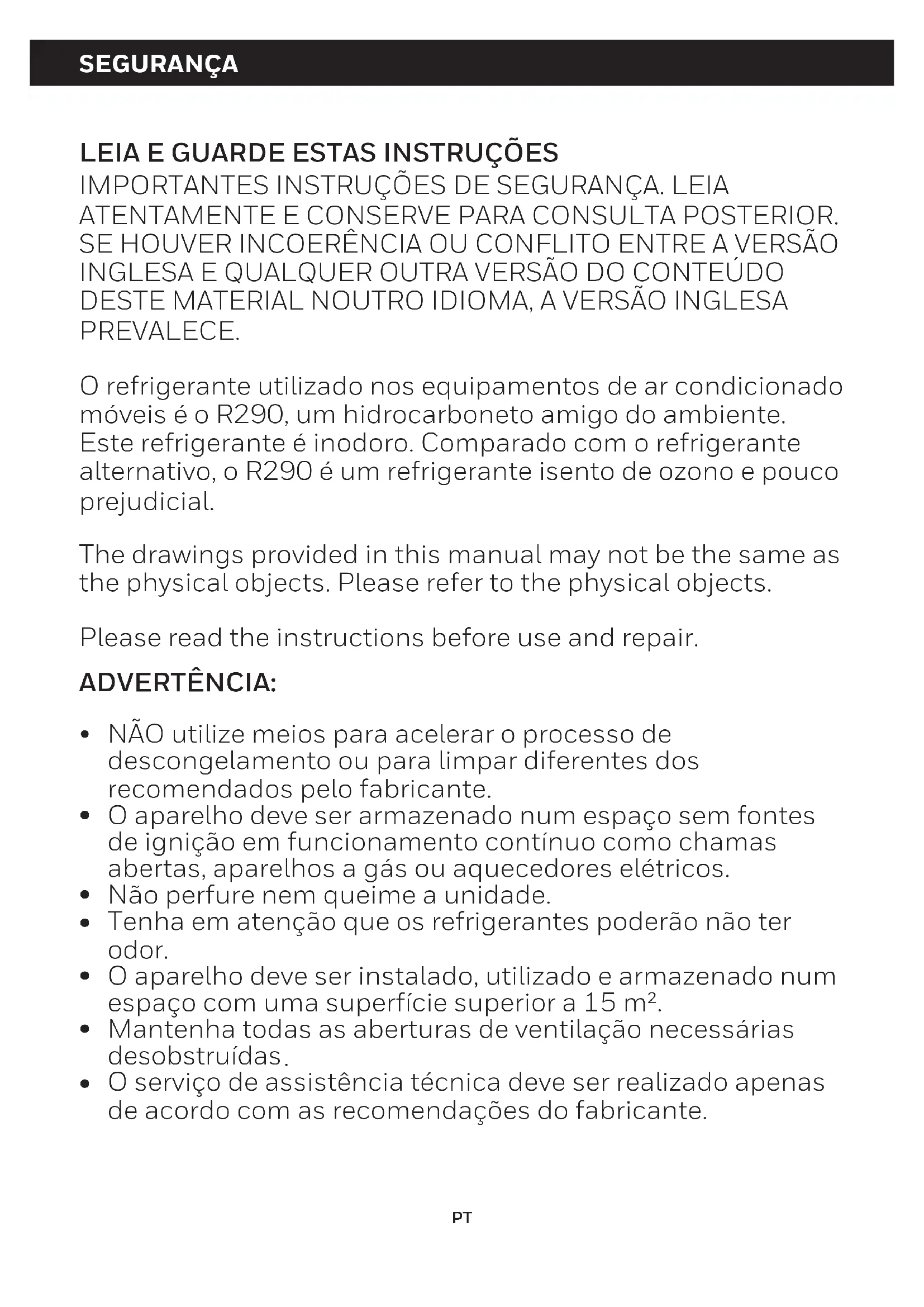 NÃO utilize meios para acelerar o processo de descongelamento ou para limpar diferentes dos recomendados pelo fabricante. O aparelho deve ser armazenado num espaço sem fontes de ignição em funcionamento contínuo como chamas abertas, aparelhos a gás ou aquecedores elétricos. Não perfure nem queime a unidade. Tenha em atenção que os refrigerantes poderão não ter odor. O aparelho deve ser instalado, utilizado e armazenado num espaço com uma superfície superior a 15 m². Mantenha todas as aberturas de ventilação necessárias desobstruídas