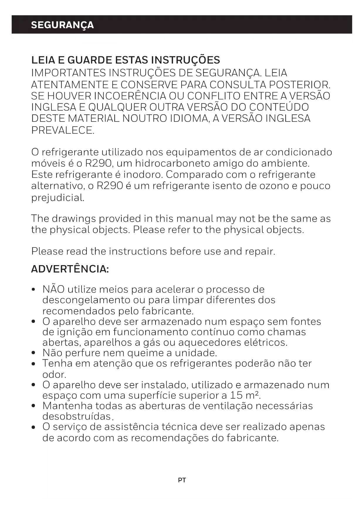 PTSEGURANÇA (CONTINUAÇÃO) As precauções básicas de segurança devem ser sempre seguidas aquando da utilização de aparelhos elétricos. A legislação nacional que rege os equipamentos elétricos e as instalações elétricas deve ser seguida. Utilize apenas o kit de instalação fornecido para instalar esta unidade. NÃO tente prolongar a mangueira ou instalar esta unidade recorrendo a métodos diferentes dos apresentados neste manual. A instalação indevida anulará quaisquer garantias existentes. Se for necessário recorrer ao serviço de assistência técnica, contacte um agente de assistência técnica autorizado. As reparações só devem ser realizadas por centros de serviço de assistência técnica autorizados do fabricante. O incumprimento destes requisitos pode constituir perigo. O transporte de equipamento que contenha refrigerantes inflamáveis deve estar em conformidade com os regulamentos aplicáveis ao transporte. A marcação do equipamento deve usar simbologia em conformidade com os regulamentos locais. A eliminação de equipamento que utilize refrigerantes inflamáveis deve estar em conformidade com os regulamentos nacionais. O armazenamento de equipamento deve ser efetuado em conformidade com as instruções do fabricante. A proteção do material de embalagem de armazenamento deve ter uma construção que evite que danos mecânicos no equipamento existente no interior da embalagem causem uma fuga da carga de refrigerante. O número máximo de peças de equipamento que podem ser armazenadas em conjunto será o determinado pelos regulamentos locais.