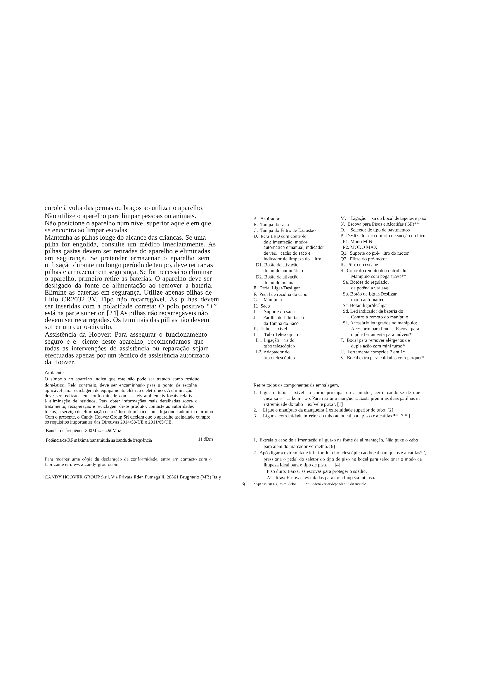 INSTRUÇÕES PARA UMA UTILIZAÇÃO SEGURA Este aparelho só deve ser utilizado para limpeza doméstica, conforme descrito neste guia do utilizador. Certique-se de que este manual é totalmente compreendido antes de utilizar o aparelho. Não deixe o aparelho ligado. Desligue sempre o aparelho e retire a cha da tomada após a utilização ou antes de o limpar ou executar qualquer tarefa de manutenção. Este aparelho pode ser utilizado por crianças com idade igual ou superior a 8 anos e por pessoas com capacidades mentais, sensoriais e físicas reduzidas ou sem experiência e conhecimento caso lhes sejam fornecidas instruções e supervisão relativas à utilização do aparelho de modo seguro e caso compreendam os perigos envolvidos. As crianças não devem brincar com o aparelho. A limpeza e a manutenção não devem ser efetuadas por crianças sem supervisão. Se o cabo de alimentação estiver danicado deixe de utilizar o aparelho imediatamente. Para evitar um risco de segurança, o cabo de alimentação deve ser substituído por um técnico de assistência autorizado da Hoover. Mantenha as mãos, os pés, as roupas largas e o cabelo longe das escovas rotativas. Utilize exclusivamente acessórios, peças sobressalentes ou consumíveis recomendados ou fornecidos pela HOOVER. Eletricidade estática: Algumas alcatifas podem provocar uma pequena acumulação de electricidade estática. A descarga de eletricidade estática não constitui qualquer perigo para a saúde. Não utilize o aparelho no exterior, em superfícies húmidas ou para aspirar líquidos. Não aspire objetos duros ou aados, fósforos, cinzas quentes, pontas de cigarro ou outros itens semelhantes. Não pulverize nem aspire líquidos inamáveis, líquidos de limpeza, aerossóis ou respetivos vapores. Não passe por cima do cabo de alimentação ao utilizar o aspirador nem retire a cha puxando pelo cabo de alimentação. Não continue a utilizar o aparelho se este parecer defeituoso. Não permaneça em cima do cabo de alimentação nem o19 enrole à volta das pernas ou braços ao utilizar o aparelho. Não utilize o aparelho para limpar pessoas ou animais. Não posicione o aparelho num nível superior aquele em que se encontra ao limpar escadas. Mantenha as pilhas longe do alcance das crianças. Se uma pilha for engolida, consulte um médico imediatamente. As pilhas gastas devem ser retiradas do aparelho e eliminadas em segurança. Se pretender armazenar o aparelho sem utilização durante um longo período de tempo, deve retirar as pilhas e armazenar em segurança. Se for necessário eliminar o aparelho, primeiro retire as baterias. O aparelho deve ser desligado da fonte de alimentação ao remover a bateria. Elimine as baterias em segurança. Utilize apenas pilhas de Lítio CR2032 3V. Tipo não recarregável. As pilhas devem ser inseridas com a polaridade correta: O polo positivo “+” está na parte superior. [24] As pilhas não recarregáveis não devem ser recarregadas. Os terminais das pilhas não devem sofrer um curto-circuito. Assistência da Hoover: Para assegurar o funcionamento seguro e eciente deste aparelho, recomendamos que todas as intervenções de assistência ou reparação sejam efectuadas apenas por um técnico de assistência autorizado da Hoover. Ambiente O símbolo no aparelho indica que este não pode ser tratado como resíduo doméstico. Pelo contrário, deve ser encaminhado para o ponto de recolha aplicável para reciclagem de equipamento elétrico e eletrónico. A eliminação deve ser realizada em conformidade com as leis ambientais locais relativas à eliminação de resíduos. Para obter informações mais detalhadas sobre o tratamento, recuperação e reciclagem deste produto, contacte as autoridades locais, o serviço de eliminação de resíduos domésticos ou a loja onde adquiriu o produto. Com o presente, o Candy Hoover Group Srl declara que o aparelho assinalado cumpre os requisitos importantes das Diretivas 2014/53/UE e 2011/65/UE. Para receber uma cópia da declaração de conformidade, entre em contacto com o fabricante em: www.candy-group.com. CANDY HOOVER GROUP S.r.l. Via Privata Eden Fumagalli, 20861 Brugherio (MB) Italy
