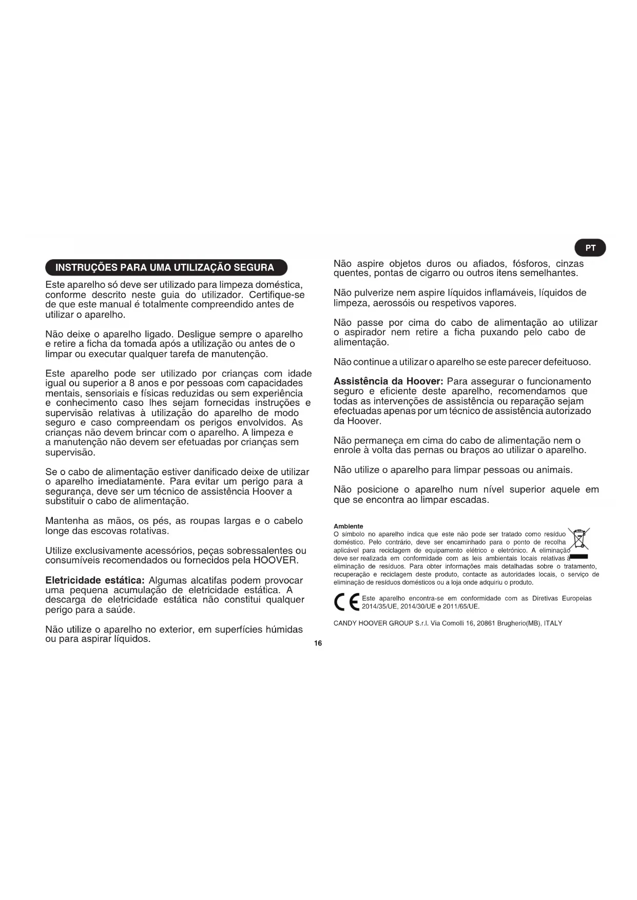 Gebruik uitsluitend originele reserveonderdelen van Hoover. Deze zijn verkrijgbaar bij uw Hoover dealer. Als u onderdelen bestelt, vermeld dan altijd het modelnummer. Hoover Service Mocht u gebruik willen maken van de service, neem dan contact op met uw Hoover dealer. KWALITEIT BSI ISO 9001 De fabrieken van Hoover zijn op onafhankelijke wijze getest op kwaliteit. Onze producten worden vervaardigd aan de hand van een kwaliteitssysteem dat voldoet aan de vereisten van ISO 9001. JOUW GARANTIE De garantievoorwaarden voor dit toestel worden bepaald door onze vertegenwoordiger in het land waar het toestel wordt verkocht. Details omtrent deze voorwaarden zijn verkrijgbaar bij de dealer waar u het toestel hebt gekocht. Wanneer u aanspraak wilt maken op deze garantie, dan moet u het verkoop- of ontvangstbewijs voorleggen. Wijzigingen zijn zonder voorafgaande kennisgeving mogelijk.16 INSTRUÇÕES PARA UMA UTILIZAÇÃO SEGURA Este aparelho só deve ser utilizado para limpeza doméstica, conforme descrito neste guia do utilizador. Certique-se de que este manual é totalmente compreendido antes de utilizar o aparelho. Não deixe o aparelho ligado. Desligue sempre o aparelho e retire a cha da tomada após a utilização ou antes de o limpar ou executar qualquer tarefa de manutenção. Este aparelho pode ser utilizado por crianças com idade igual ou superior a 8 anos e por pessoas com capacidades mentais, sensoriais e físicas reduzidas ou sem experiência e conhecimento caso lhes sejam fornecidas instruções e supervisão relativas à utilização do aparelho de modo seguro e caso compreendam os perigos envolvidos. As crianças não devem brincar com o aparelho. A limpeza e a manutenção não devem ser efetuadas por crianças sem supervisão. Se o cabo de alimentação estiver danicado deixe de utilizar o aparelho imediatamente. Para evitar um perigo para a segurança, deve ser um técnico de assistência Hoover a substituir o cabo de alimentação. Mantenha as mãos, os pés, as roupas largas e o cabelo longe das escovas rotativas. Utilize exclusivamente acessórios, peças sobressalentes ou consumíveis recomendados ou fornecidos pela HOOVER. Eletricidade estática: Algumas alcatifas podem provocar uma pequena acumulação de eletricidade estática. A descarga de eletricidade estática não constitui qualquer perigo para a saúde. Não utilize o aparelho no exterior, em superfícies húmidas ou para aspirar líquidos. Não aspire objetos duros ou aados, fósforos, cinzas quentes, pontas de cigarro ou outros itens semelhantes. Não pulverize nem aspire líquidos inamáveis, líquidos de limpeza, aerossóis ou respetivos vapores. Não passe por cima do cabo de alimentação ao utilizar o aspirador nem retire a cha puxando pelo cabo de alimentação. Não continue a utilizar o aparelho se este parecer defeituoso. Assistência da Hoover: Para assegurar o funcionamento seguro e eciente deste aparelho, recomendamos que todas as intervenções de assistência ou reparação sejam efectuadas apenas por um técnico de assistência autorizado da Hoover. Não permaneça em cima do cabo de alimentação nem o enrole à volta das pernas ou braços ao utilizar o aparelho. Não utilize o aparelho para limpar pessoas ou animais. Não posicione o aparelho num nível superior aquele em que se encontra ao limpar escadas. Ambiente O símbolo no aparelho indica que este não pode ser tratado como resíduo doméstico. Pelo contrário, deve ser encaminhado para o ponto de recolha aplicável para reciclagem de equipamento elétrico e eletrónico. A eliminação deve ser realizada em conformidade com as leis ambientais locais relativas à eliminação de resíduos. Para obter informações mais detalhadas sobre o tratamento, recuperação e reciclagem deste produto, contacte as autoridades locais, o serviço de eliminação de resíduos domésticos ou a loja onde adquiriu o produto. Este aparelho encontra-se em conformidade com as Diretivas Europeias 2014/35/UE, 2014/30/UE e 2011/65/UE. CANDY HOOVER GROUP S.r.l. Via Comolli 16, 20861 Brugherio(MB), ITALY PT17 L. Controlo Deslizante de Sucção M. Escova para Pavimentos e Alcatifas** N. Aspirador O. Patilha de Libertação da Tampa do Saco P. Suporte do saco Q. Suporte do pré-ltro do motor R. Filtro do pré-motor S. Filtro de exaustão T. Escova para remover pelos de animais* U. Mini escova turbo para remoção de alergéneos*