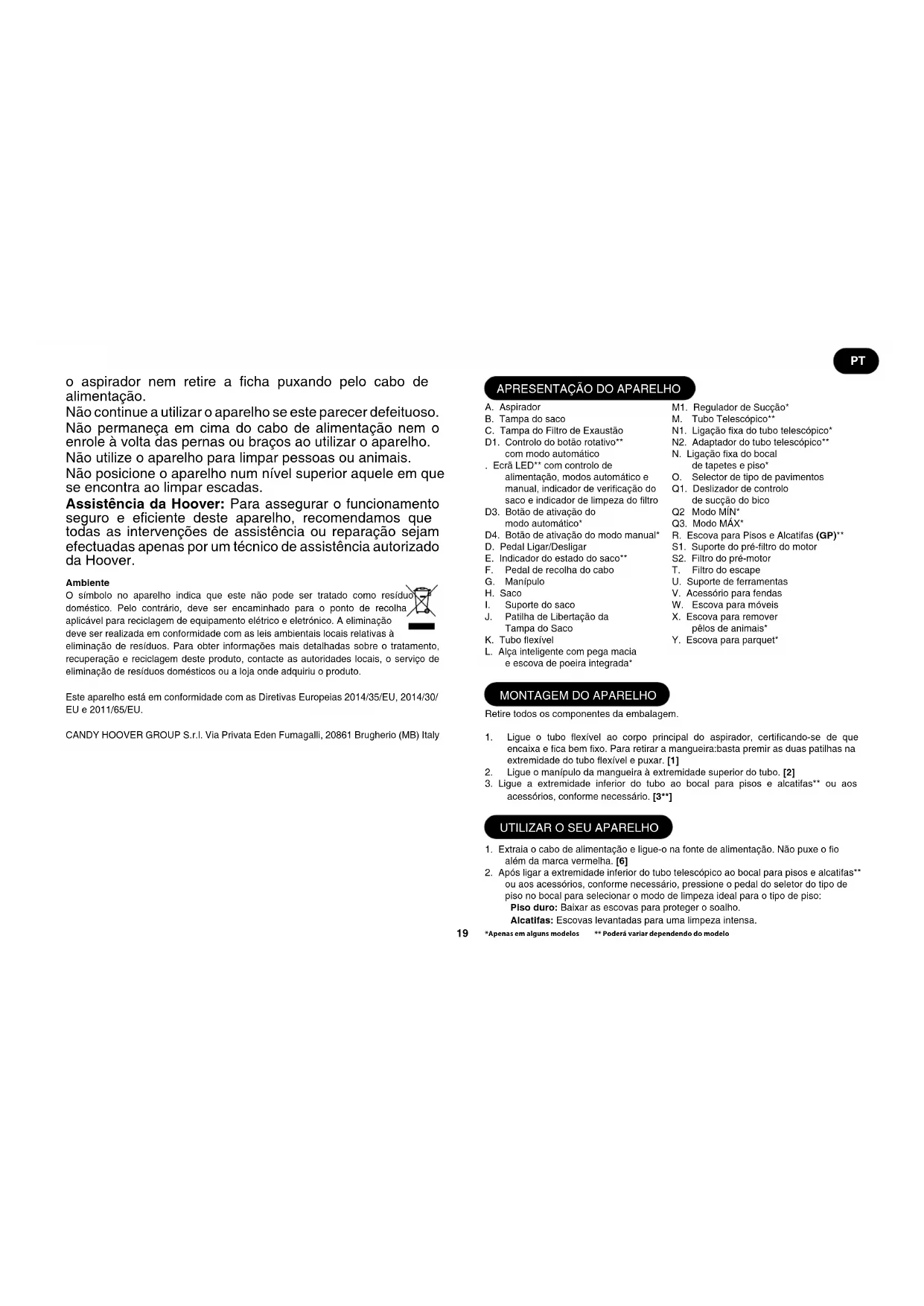 Gebruik uitsluitend originele reserveonderdelen van Hoover. Deze zijn verkrijgbaar bij uw Hoover dealer. Als u onderdelen bestelt, vermeld dan altijd het modelnummer. Hoover Service Mocht u gebruik willen maken van de service, neem dan contact op met uw Hoover dealer. KWALITEIT De fabrieken van HOOVER zijn op onafhankelijke wijze getest op kwaliteit. Onze producten worden vervaardigd aan de hand van een kwaliteitssysteem dat voldoet aan de vereisten van ISO 9001. JOUW GARANTIE De garantievoorwaarden voor dit toestel worden bepaald door onze vertegenwoordiger in het land waar het toestel wordt verkocht. Details omtrent deze voorwaarden zijn verkrijgbaar bij de dealer waar u het toestel hebt gekocht. Wanneer u aanspraak wilt maken op deze garantie, dan moet u het verkoop- of ontvangstbewijs voorleggen. Wijzigingen zijn zonder voorafgaande kennisgeving mogelijk. INSTRUÇÕES PARA UMA UTILIZAÇÃO SEGURA Este aparelho só deve ser utilizado para limpeza doméstica, conforme descrito neste guia do utilizador. Certique-se de que este manual é totalmente compreendido antes de utilizar o aparelho. Não deixe o aparelho ligado. Desligue sempre o aparelho e retire a cha da tomada após a utilização ou antes de o limpar ou executar qualquer tarefa de manutenção. Este aparelho pode ser utilizado por crianças com idade igual ou superior a 8 anos e por pessoas com capacidades mentais, sensoriais e físicas reduzidas ou sem experiência e conhecimento caso lhes sejam fornecidas instruções e supervisão relativas à utilização do aparelho de modo seguro e caso compreendam os perigos envolvidos. As crianças não devem brincar com o aparelho. A limpeza e a manutenção não devem ser efetuadas por crianças sem supervisão. Se o cabo de alimentação estiver danicado deixe de utilizar o aparelho imediatamente. Para evitar um perigo para a segurança, deve ser um técnico de assistência Hoover a substituir o cabo de alimentação. Mantenha as mãos, os pés, as roupas largas e o cabelo longe das escovas rotativas. Utilize exclusivamente acessórios, peças sobressalentes ou consumíveis recomendados ou fornecidos pela HOOVER. Eletricidade estática: Algumas alcatifas podem provocar uma pequena acumulação de electricidade estática. A descarga de eletricidade estática não constitui qualquer perigo para a saúde. Não utilize o aparelho no exterior, em superfícies húmidas ou para aspirar líquidos. Não aspire objetos duros ou aados, fósforos, cinzas quentes, pontas de cigarro ou outros itens semelhantes. Não pulverize nem aspire líquidos inamáveis, líquidos de limpeza, aerossóis ou respetivos vapores. Não passe por cima do cabo de alimentação ao utilizar PT19 o aspirador nem retire a cha puxando pelo cabo de alimentação. Não continue a utilizar o aparelho se este parecer defeituoso. Não permaneça em cima do cabo de alimentação nem o enrole à volta das pernas ou braços ao utilizar o aparelho. Não utilize o aparelho para limpar pessoas ou animais. Não posicione o aparelho num nível superior aquele em que se encontra ao limpar escadas. Assistência da Hoover: Para assegurar o funcionamento seguro e eciente deste aparelho, recomendamos que todas as intervenções de assistência ou reparação sejam efectuadas apenas por um técnico de assistência autorizado da Hoover. Ambiente O símbolo no aparelho indica que este não pode ser tratado como resíduo doméstico. Pelo contrário, deve ser encaminhado para o ponto de recolha aplicável para reciclagem de equipamento elétrico e eletrónico. A eliminação deve ser realizada em conformidade com as leis ambientais locais relativas à eliminação de resíduos. Para obter informações mais detalhadas sobre o tratamento, recuperação e reciclagem deste produto, contacte as autoridades locais, o serviço de eliminação de resíduos domésticos ou a loja onde adquiriu o produto. Este aparelho está em conformidade com as Diretivas Europeias 2014/35/EU, 2014/30/ EU e 2011/65/EU. CANDY HOOVER GROUP S.r.l. Via Privata Eden Fumagalli, 20861 Brugherio (MB) Italy