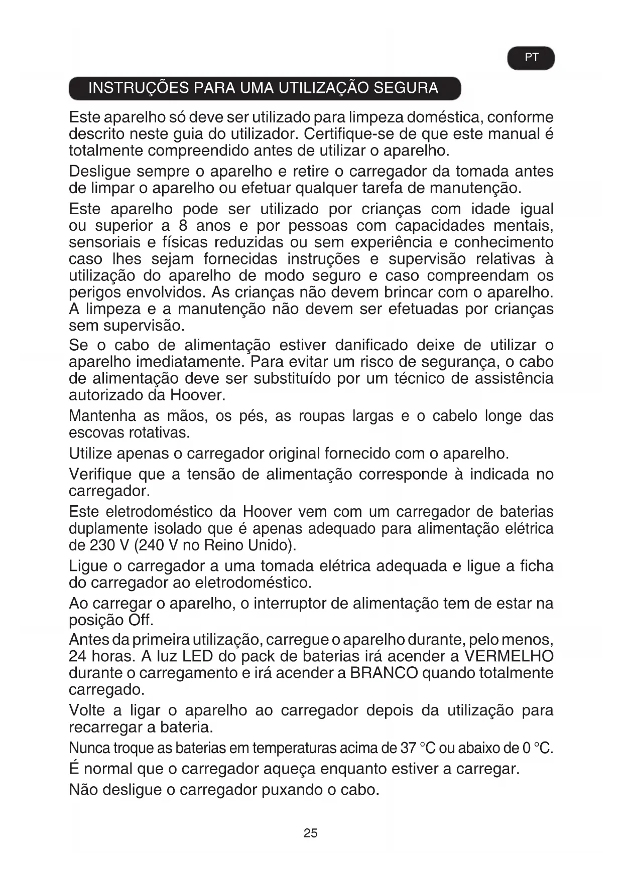 Questo prodotto è garantito, oltre che ai sensi di legge, alle condizioni e nei termini riportati sul certicato di garanzia convenzionale inserito nel prodotto. Il certicato dovrà essere conservato e mostrato al nostro Centro di Assistenza Tecnica Autorizzato, in caso di necessità, insieme allo scontrino comprovante l’acquisto dell’elettrodomestico. Puoi consultare le condizioni di garanzia anche sul nostro sito internet Per ottenere assistenza compila l’apposito form on-line oppure contattaci al numero che trovi indicato nella pagina di assistenza del nostro sito internet Queste condizioni potrebbero venire modicate senza obbligo di preavviso.25 INSTRUÇÕES PARA UMA UTILIZAÇÃO SEGURA Este aparelho só deve ser utilizado para limpeza doméstica, conforme descrito neste guia do utilizador. Certifique-se de que este manual é totalmente compreendido antes de utilizar o aparelho. Desligue sempre o aparelho e retire o carregador da tomada antes de limpar o aparelho ou efetuar qualquer tarefa de manutenção. Este aparelho pode ser utilizado por crianças com idade igual ou superior a 8 anos e por pessoas com capacidades mentais, sensoriais e físicas reduzidas ou sem experiência e conhecimento caso lhes sejam fornecidas instruções e supervisão relativas à utilização do aparelho de modo seguro e caso compreendam os perigos envolvidos. As crianças não devem brincar com o aparelho. A limpeza e a manutenção não devem ser efetuadas por crianças sem supervisão. Se o cabo de alimentação estiver danificado deixe de utilizar o aparelho imediatamente. Para evitar um risco de segurança, o cabo de alimentação deve ser substituído por um técnico de assistência autorizado da Hoover. Mantenha as mãos, os pés, as roupas largas e o cabelo longe das escovas rotativas. Utilize apenas o carregador original fornecido com o aparelho. Verifique que a tensão de alimentação corresponde à indicada no carregador. Este eletrodoméstico da Hoover vem com um carregador de baterias duplamente isolado que é apenas adequado para alimentação elétrica de 230 V (240 V no Reino Unido). Ligue o carregador a uma tomada elétrica adequada e ligue a ficha do carregador ao eletrodoméstico. Ao carregar o aparelho, o interruptor de alimentação tem de estar na posição Off. Antes da primeira utilização, carregue o aparelho durante, pelo menos, 24 horas. A luz LED do pack de baterias irá acender a VERMELHO durante o carregamento e irá acender a BRANCO quando totalmente carregado. Volte a ligar o aparelho ao carregador depois da utilização para recarregar a bateria. Nunca troque as baterias em temperaturas acima de 37 °C ou abaixo de 0 °C. É normal que o carregador aqueça enquanto estiver a carregar. Não desligue o carregador puxando o cabo. PT26 Desligue o carregador em caso de ausência prolongada (férias, etc.). Recarregue novamente o produto antes de utilizar, pois a bateria pode descarregar durante longos períodos de armazenamento. Se for necessário eliminar o aparelho, primeiro retire as baterias. O aparelho deve ser desligado da fonte de alimentação ao remover a bateria. Elimine as baterias em segurança. Deixe o aparelho em funcionamento até parar devido ao facto de as baterias estarem completamente descarregadas. As pilhas usadas devem ser levadas para uma estação de reciclagem e não devem ser colocadas no lixo doméstico. Para remover as baterias, contacte o centro de apoio ao cliente da Hoover ou prossiga de acordo com as instruções seguintes. IMPORTANTE: Descarregue, sempre, na totalidade as baterias antes da as remover. Coloque o aspirador em funcionamento até a bateria estar totalmente descarregada. Remova a ficha de tomada do carregador do aparelho. Prima os botões de libertação do pack de baterias e deslize para remover. [11] NOTA: Caso experiencie qualquer dificuldade na desmontagem da unidade ou necessite de informações mais detalhadas sobre o trabalho, recuperação e reciclagem deste aparelho, contacte o departamento da sua cidade ou o serviço de eliminação de lixo doméstico. Utilize apenas acessórios, consumíveis ou peças sobressalentes recomendadas ou fornecidas pela Hoover. Eletricidade estática: Algumas alcatifas podem provocar uma pequena acumulação de eletricidade estática. A descarga de eletricidade estática não constitui qualquer perigo para a saúde. Não utilize o aparelho no exterior, em superfícies húmidas ou para aspirar líquidos. Não aspire objetos duros ou afiados, fósforos, cinzas quentes, pontas de cigarro ou outros itens semelhantes. Não pulverize nem aspire líquidos inflamáveis, líquidos de limpeza, aerossóis ou respetivos vapores. Não passe por cima do cabo de alimentação ao utilizar o aspirador nem retire a ficha puxando pelo cabo de alimentação. Não continue a utilizar o aparelho ou o carregador caso aparente estar defeituoso. Assistência da Hoover: Para assegurar o funcionamento seguro e eficiente deste aparelho, recomendamos que todas as intervenções de assistência ou reparação sejam efetuadas apenas por um técnico de assistência autorizado da Hoover.