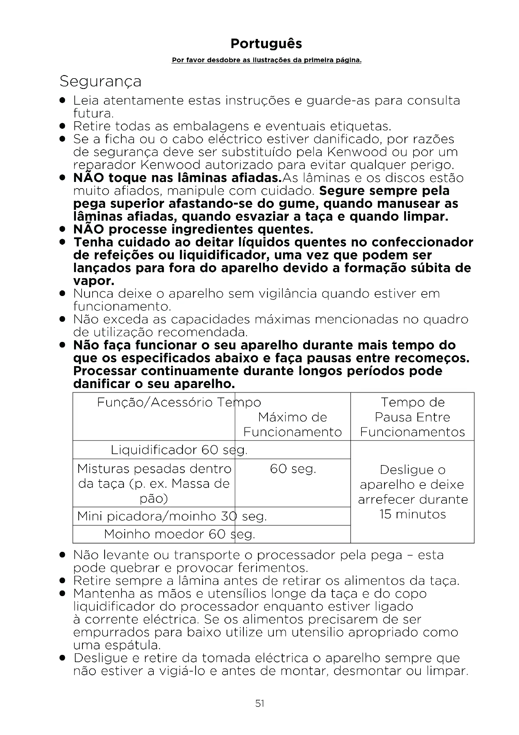 Não faça funcionar o seu aparelho durante mais tempo do que os especificados abaixo e faça pausas entre recomeços. Processar continuamente durante longos períodos pode danificar o seu aparelho. Função/Acessório Tempo Máximo de Funcionamento Tempo de Pausa Entre Funcionamentos Liquidificador 60 seg. Desligue o aparelho e deixe arrefecer durante 15 minutos Misturas pesadas dentro da taça (p. ex. Massa de pão) 60 seg. Mini picadora/moinho 30 seg. Moinho moedor 60 seg.